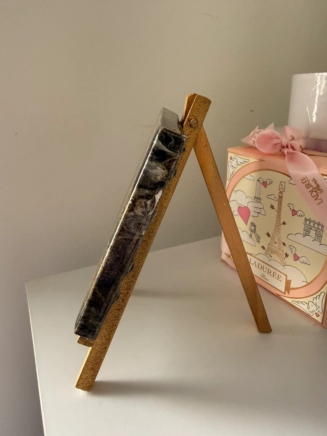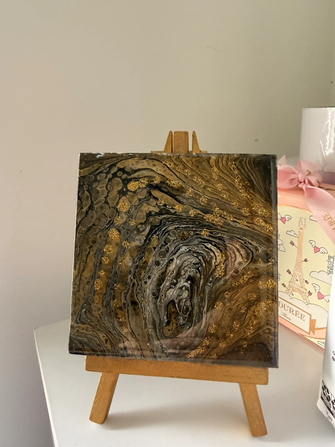 Small abstract painting featuring a swirl pattern in brown, black, and gold tones. It's mounted on a small wooden easel. The artwork has a glossy finish.