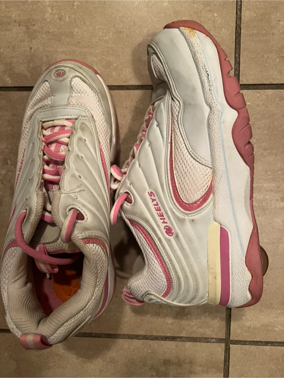 Selling a pair of Heelys roller shoes in white and pink! They're gently used but still have lots of life left. Perfect for some fun rolling around!