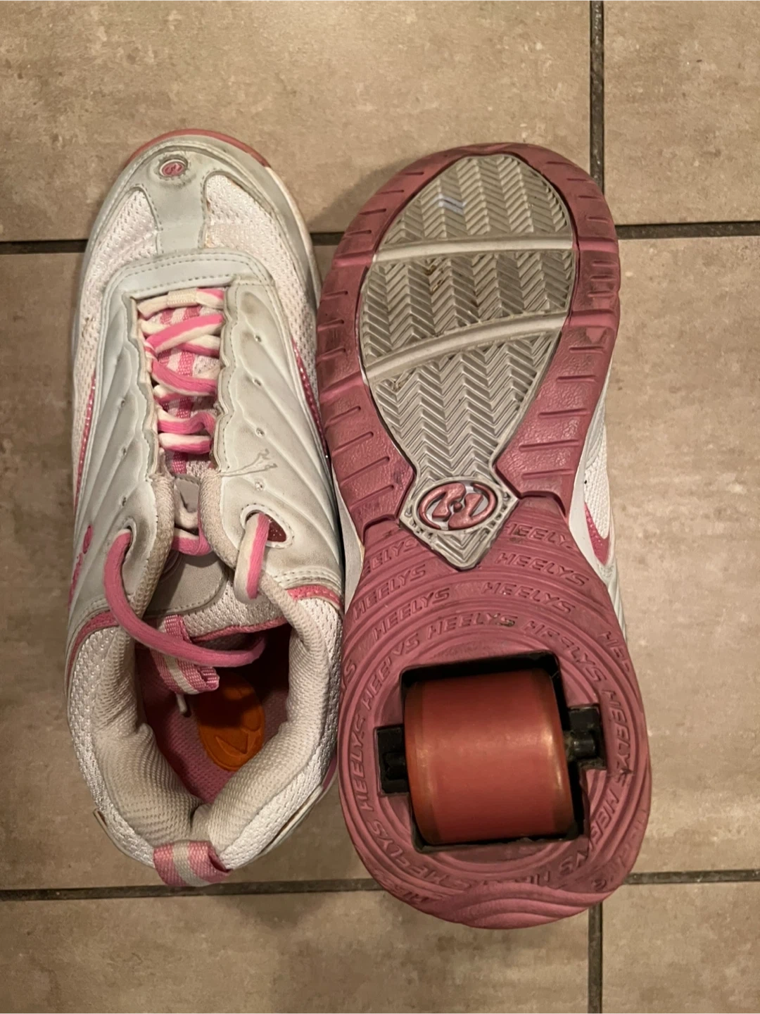 Selling a pair of Heelys roller shoes in white and pink! They're gently used but still have lots of life left. Perfect for some fun rolling around!