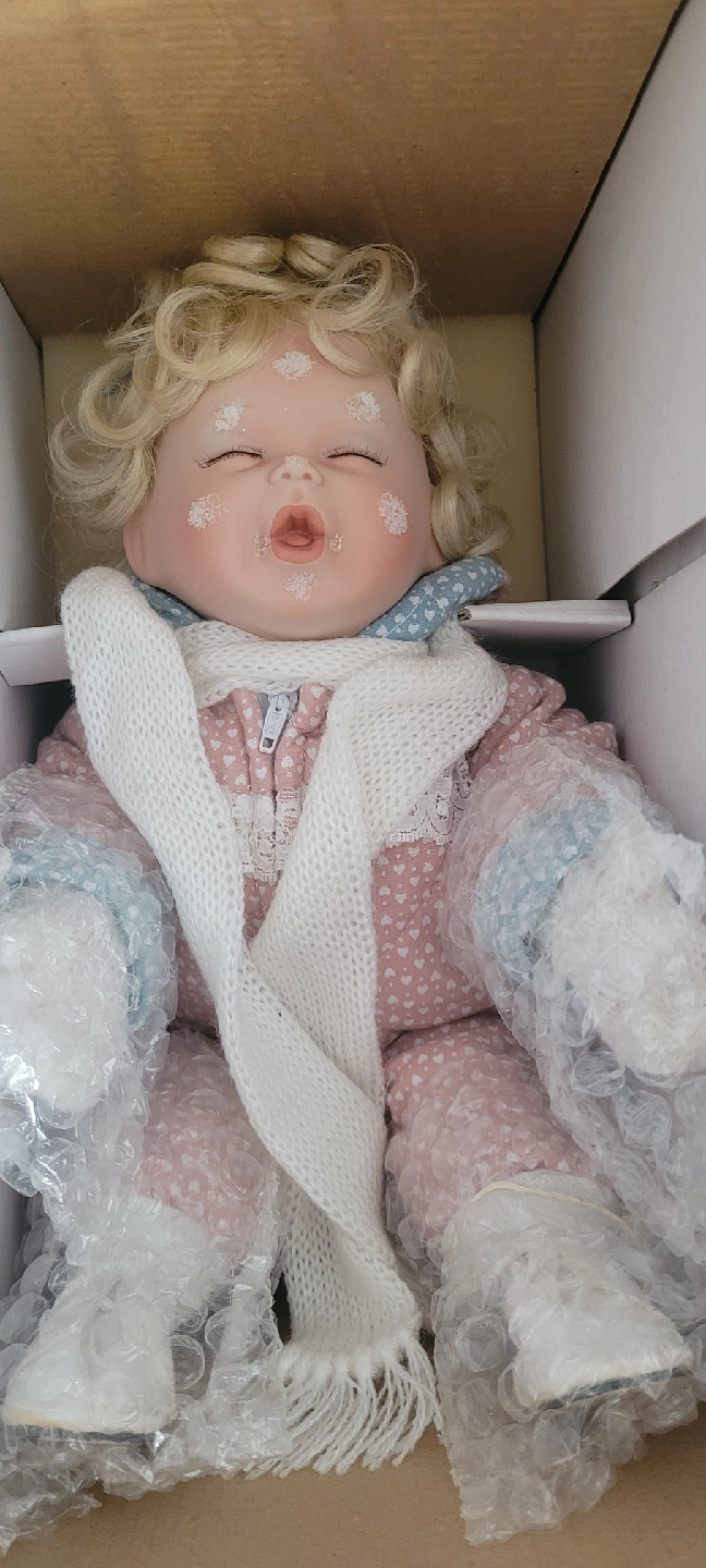 Selling an Ashton Drake Galleries doll. It comes with its original box and a small bag of artificial snow.