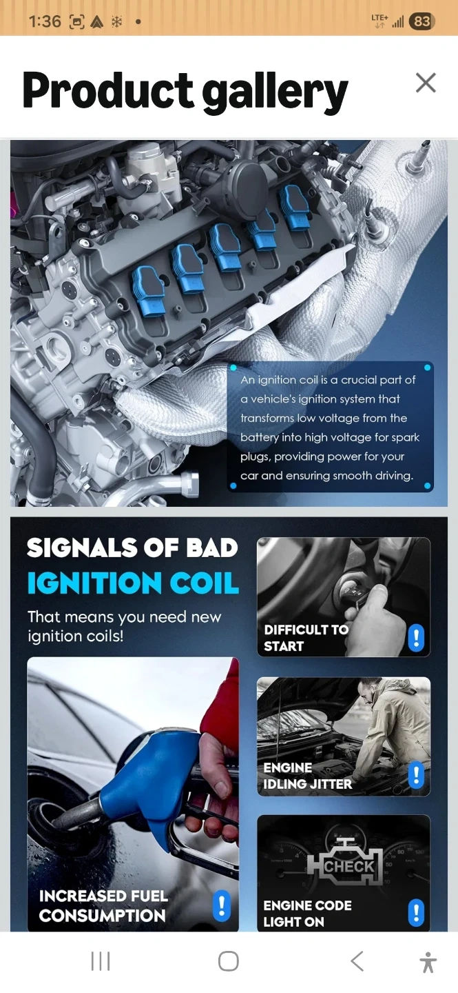 Set of 6 ignition coils with iridium spark plugs. Designed for 100000km service life and quick ignition. Helps reduce fuel consumption and misfires.