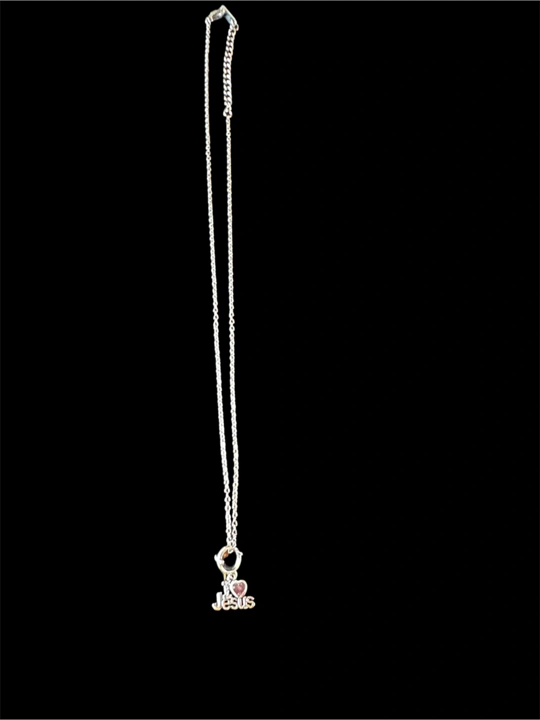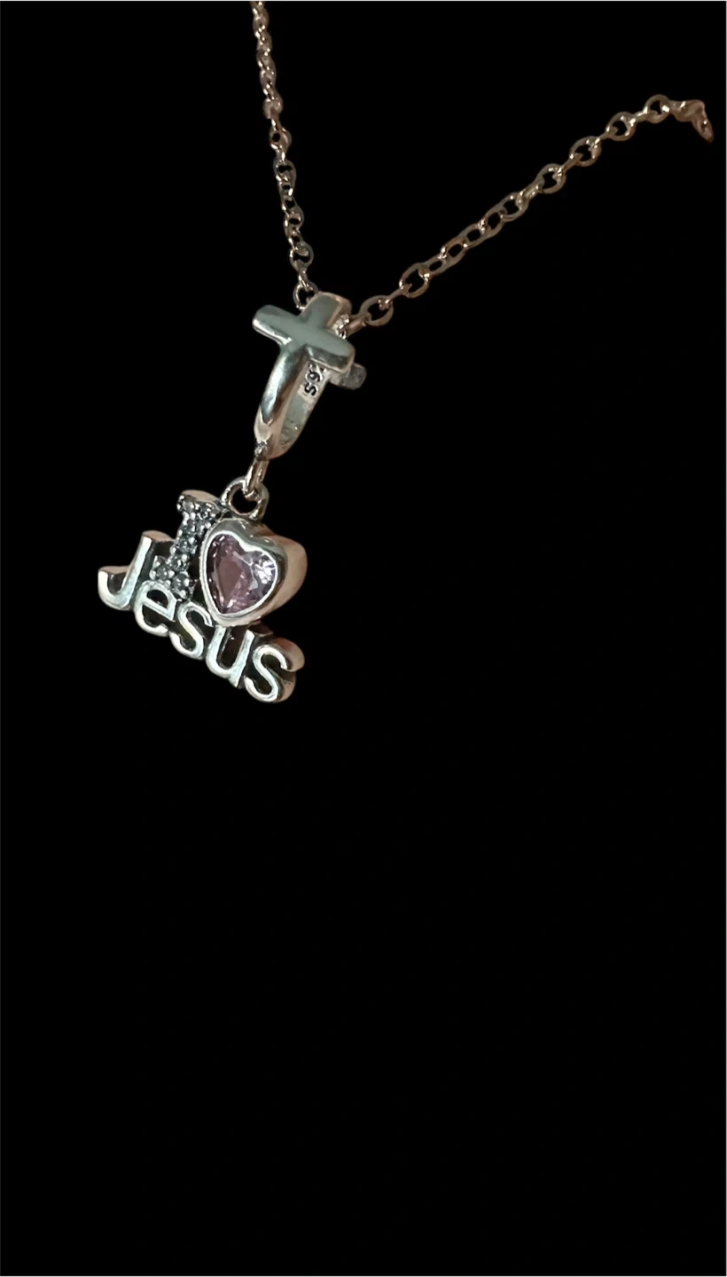 18in stainless steel necklace with an "I Love Jesus" pendant. The pendant features a cross and a heart detail. Comes with box.