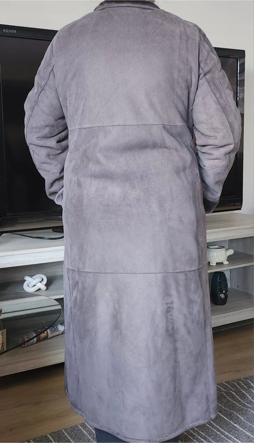 This is a Novelty brand maxi coat in a grey colour. It features a soft, suede-like exterior and a faux fur lining for warmth. The coat has a button-up front and a comfortable L/G size. It's a stylish option for cooler weather!
