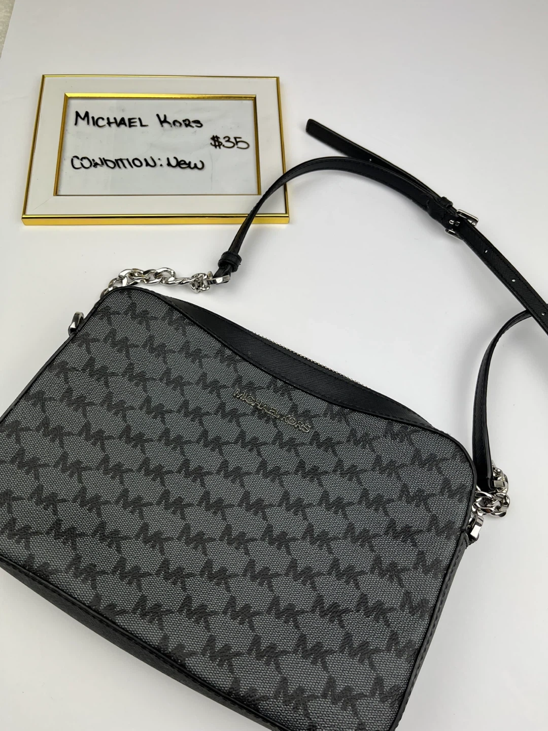 This Michael Kors crossbody bag showcases the brand's signature MK monogram pattern in black and grey. It's a compact size with a chain and leather shoulder strap. The interior has multiple pockets for organization.