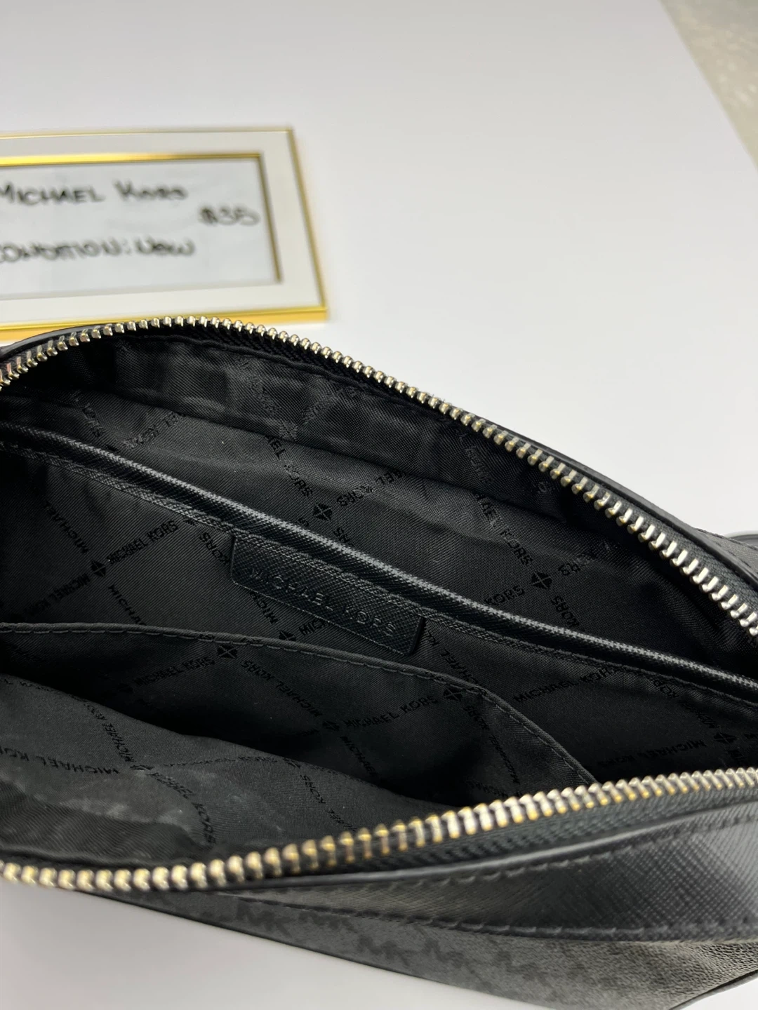 This Michael Kors crossbody bag showcases the brand's signature MK monogram pattern in black and grey. It's a compact size with a chain and leather shoulder strap. The interior has multiple pockets for organization.