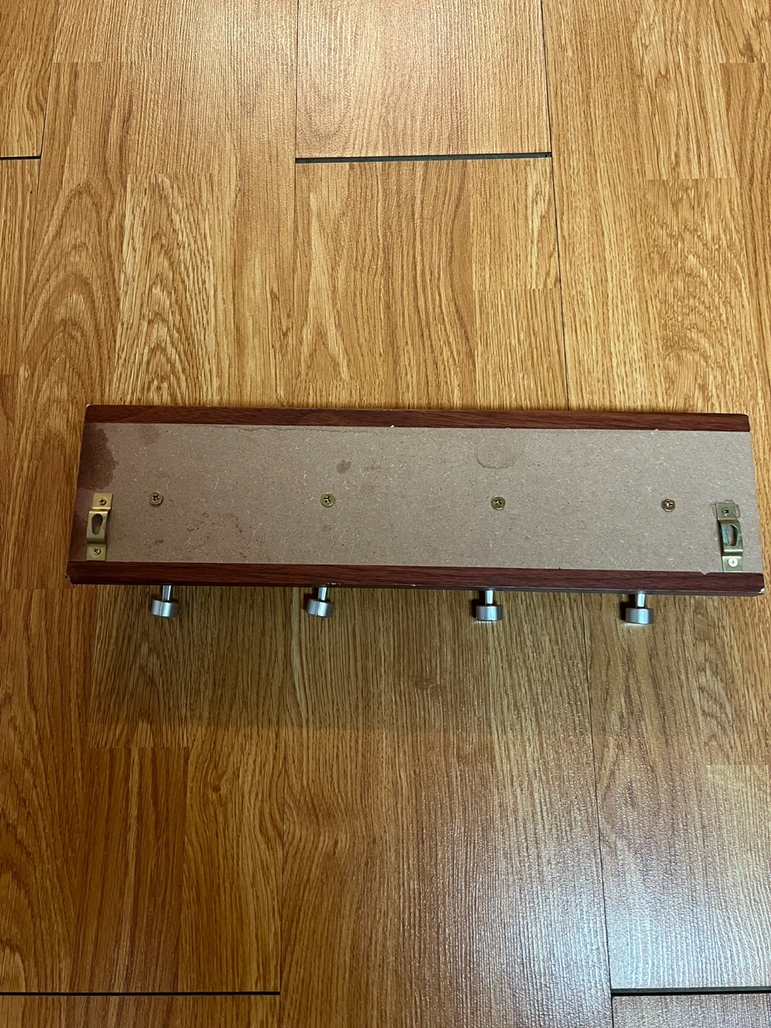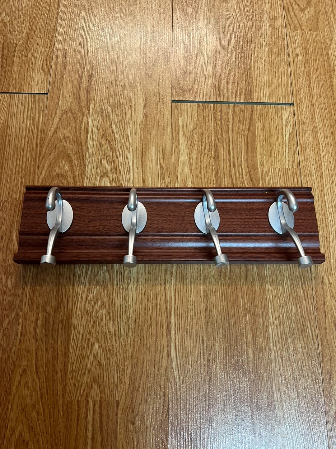 Here's a handy coat rack with four sturdy hooks! It's perfect for keeping your jackets, hats, and bags organized. The wooden base has a nice, classic look that would fit well in an entryway or closet. It's in great shape and ready to use!