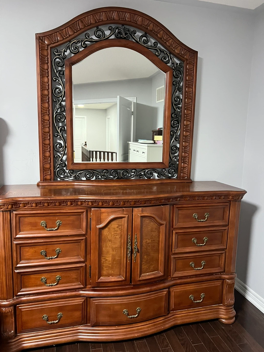 This is a beautiful solid wood dresser with an ornate mirror. It features a rich wood finish and detailed carvings. The dresser has multiple drawers and a central cabinet for ample storage. It's a sturdy and elegant piece for any bedroom. This dresser would be useful for organizing clothing and accessories.