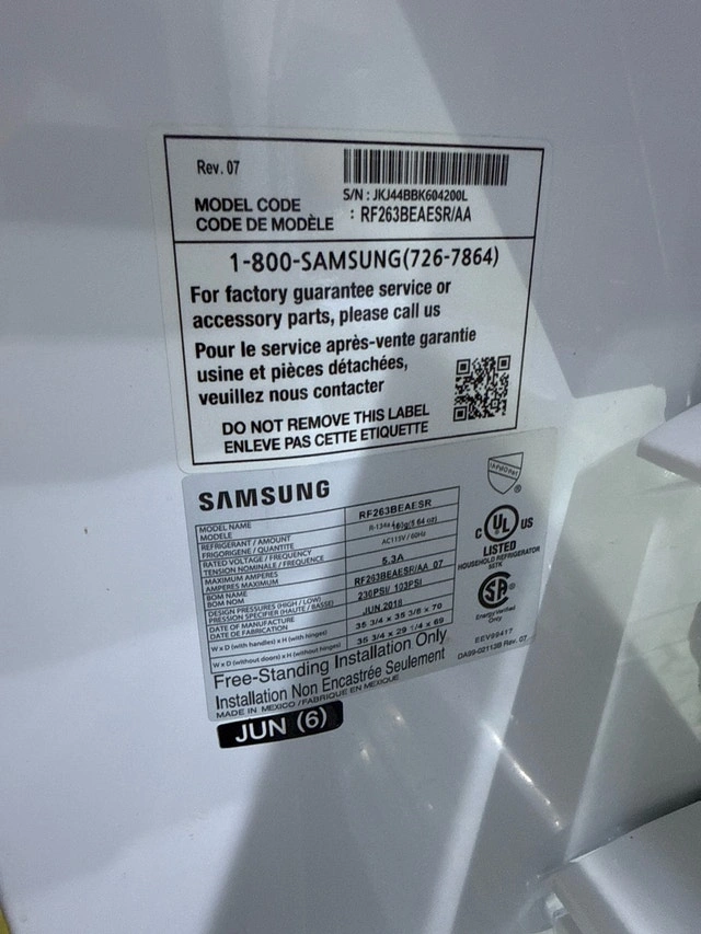 Samsung French door refrigerator in stainless steel for sale. Model: RF263BEAESR/AA. The fridge and freezer work properly and it is currently in use. The only known issue is that the ice maker is not working. Good used condition with normal cosmetic wear from use. Selling because I am renovating my kitchen and replacing my appliances. It will be available in approximately 6 weeks once my new appliances arrive. Pickup only. Buyer responsible for moving.