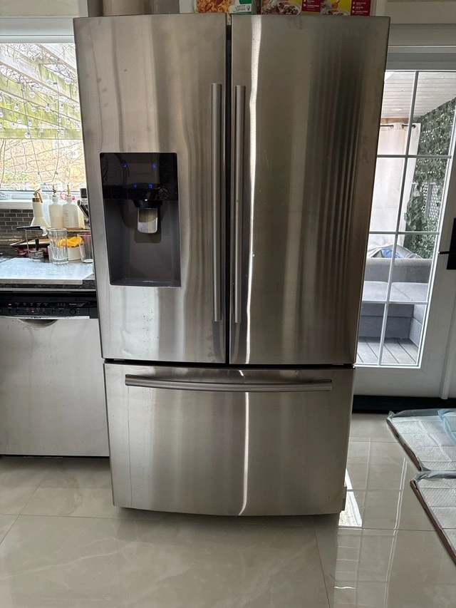 Samsung French door refrigerator in stainless steel for sale. Model: RF263BEAESR/AA. The fridge and freezer work properly and it is currently in use. The only known issue is that the ice maker is not working. Good used condition with normal cosmetic wear from use. Selling because I am renovating my kitchen and replacing my appliances. It will be available in approximately 6 weeks once my new appliances arrive. Pickup only. Buyer responsible for moving.