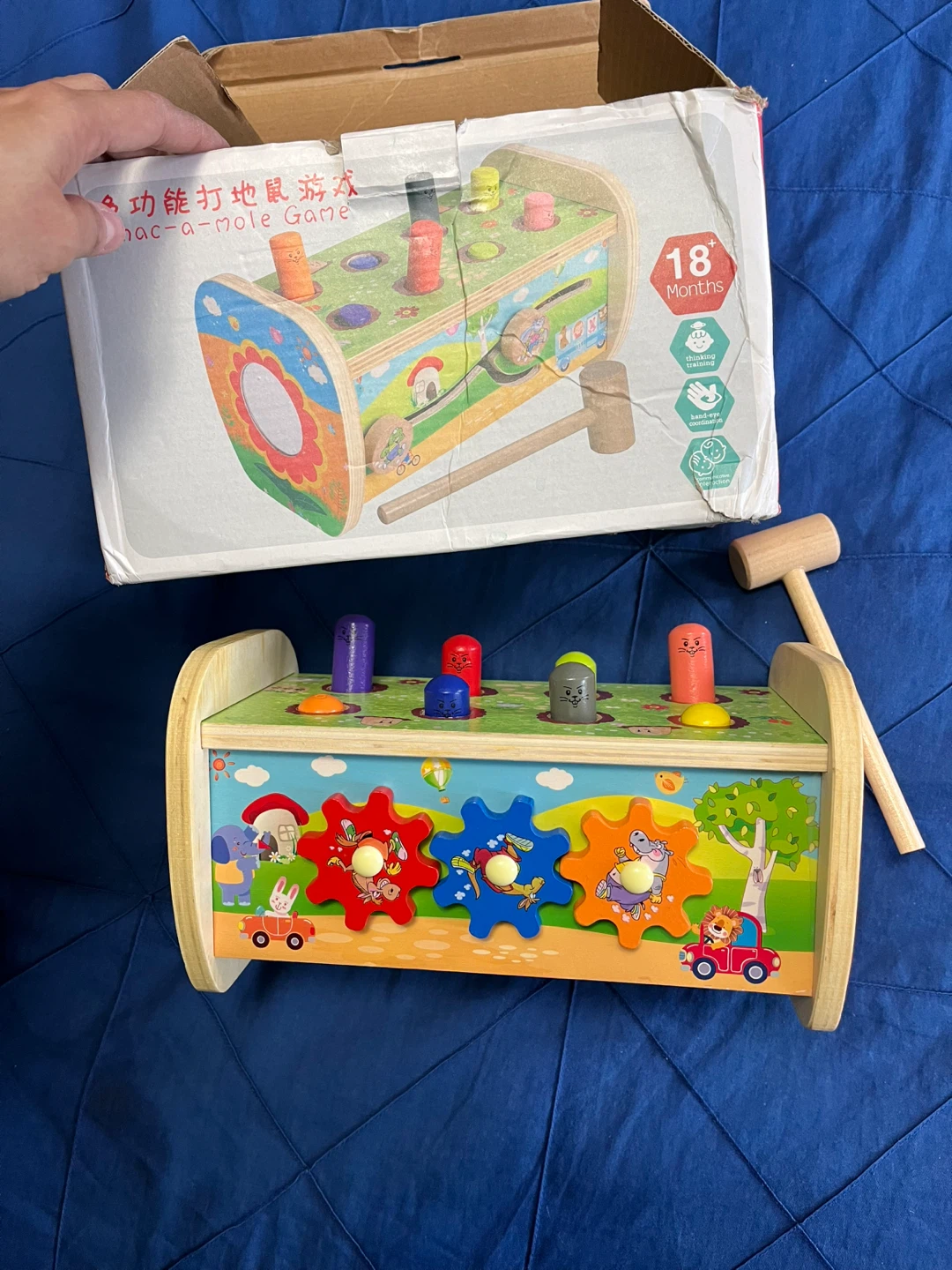 Selling a Whac-a-Mole game suitable for children 18 months and older! It includes the hammer and box. Each side has a different fun activity for the child. Best way to build eye hand coordination and muscle. Also great positive way to take the extra energy out of children as they bang on the you..helping them calm down.