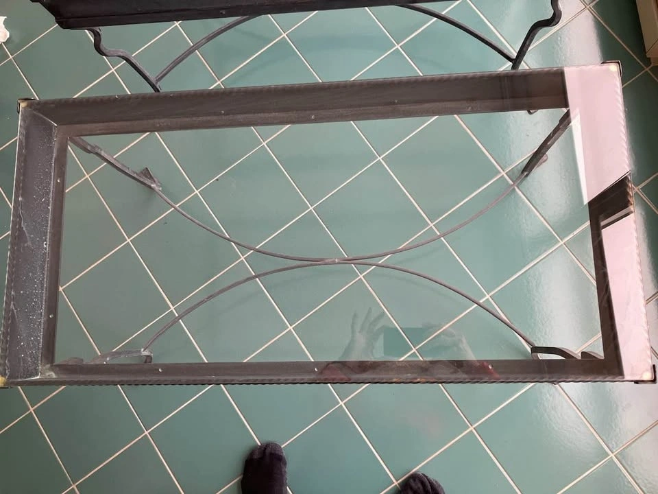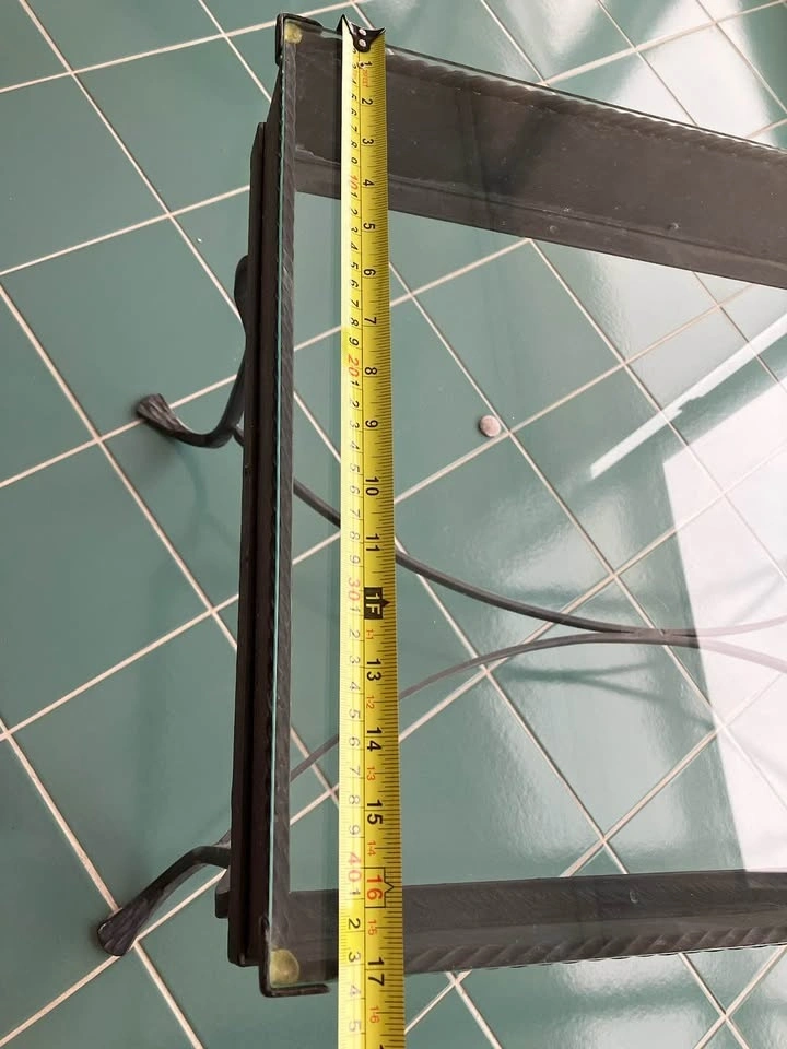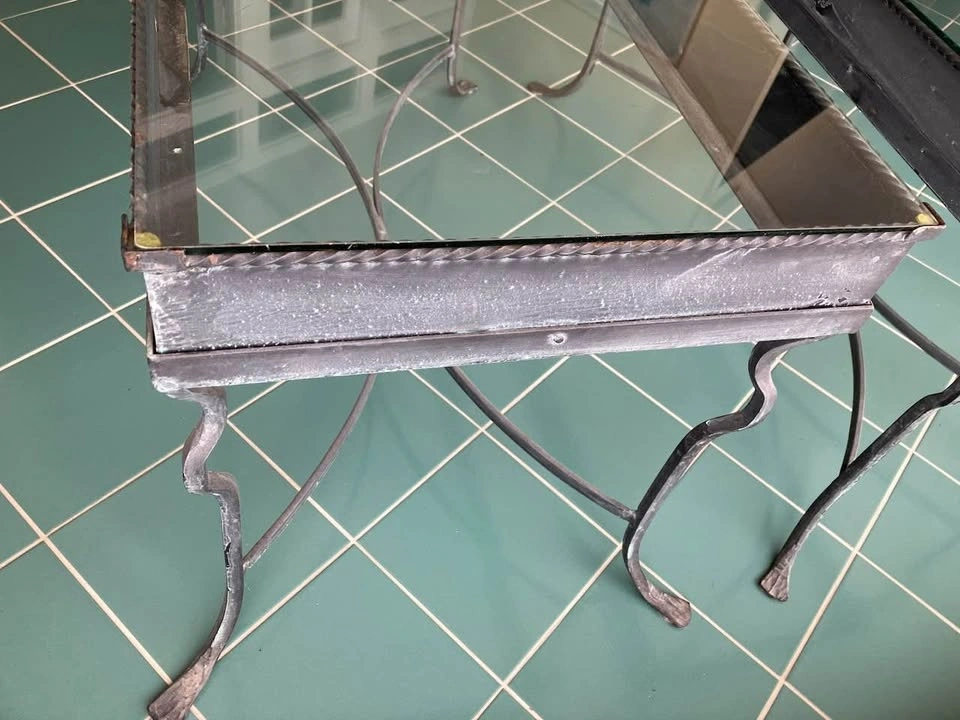 Stylish pair of glass top tables. Black metal bases with cool curved legs. Glass tops are clear. Tables measure about 35.5 inches long and 17 inches wide. Good for living room or as side tables.
