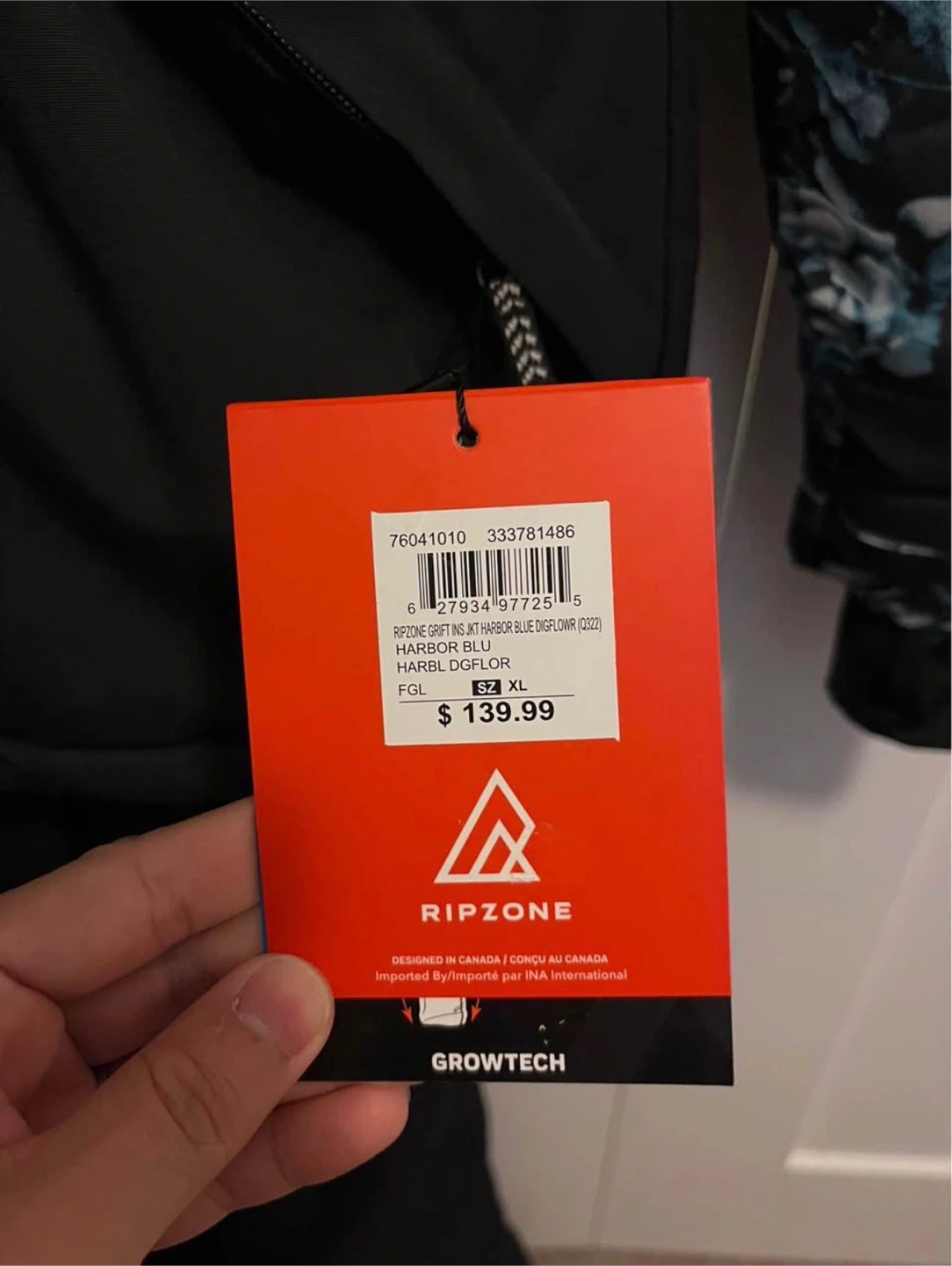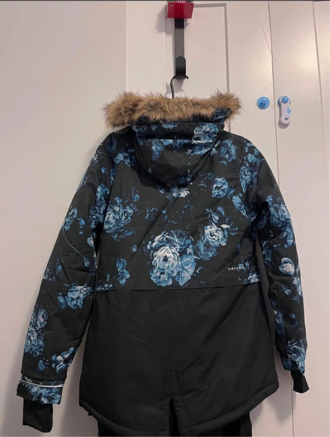 This Ripzone girls ski jacket is a size XL = women size S-M, and features a blue floral pattern. It's designed for cold weather activities. It has a sherpa-lined interior for warmth. Made in Canada.