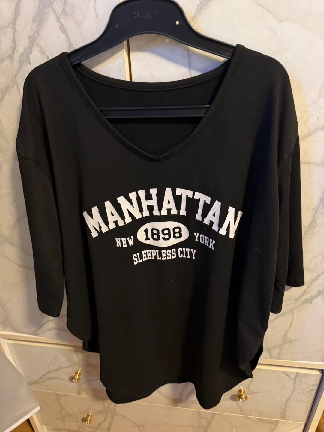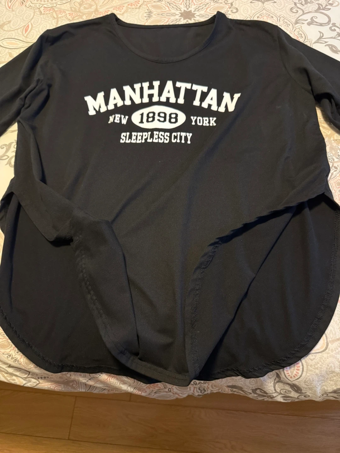 black t-shirt from Dazy features a "Manhattan 1898 Sleepless City" graphic print. It's a size Large with a slit curved hem. Very stretchy and comfortable. Barely worn and in perfect condition.