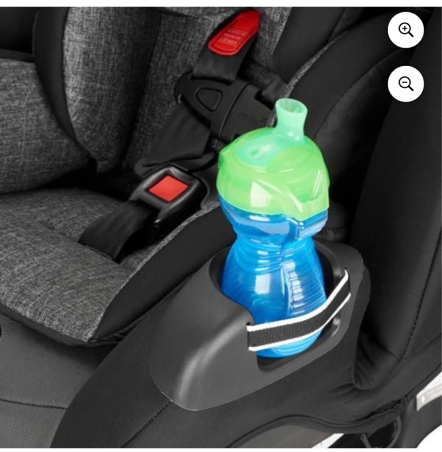 This is an Evenflo car seat in black and grey. It has adjustable straps and cup holders. It's suitable for infants and toddlers.