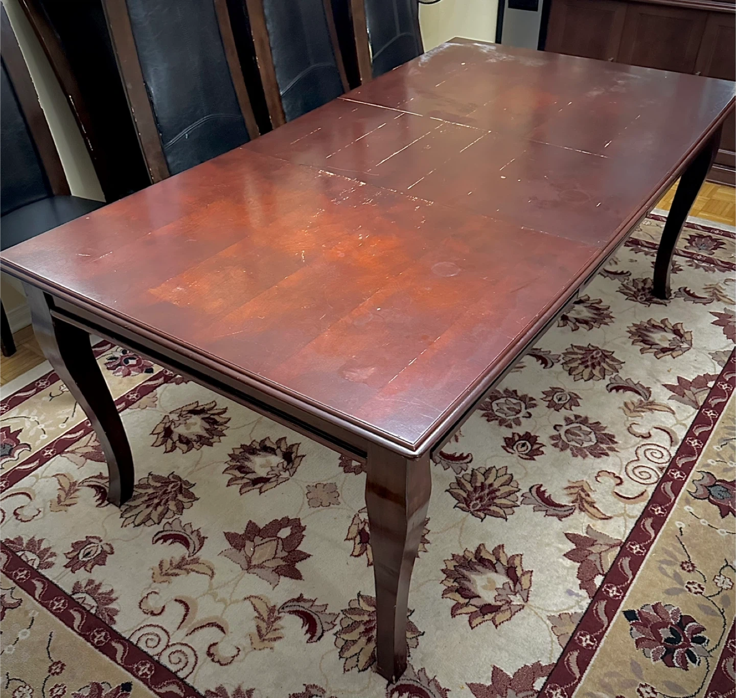 Selling a wooden dining table. It's in used condition with some visible wear and tear on the surface, as shown in the photos. Still a sturdy piece of furniture and you can cover it with a table cloth! It is extendable to 78” length with an 18” centre leaf.
