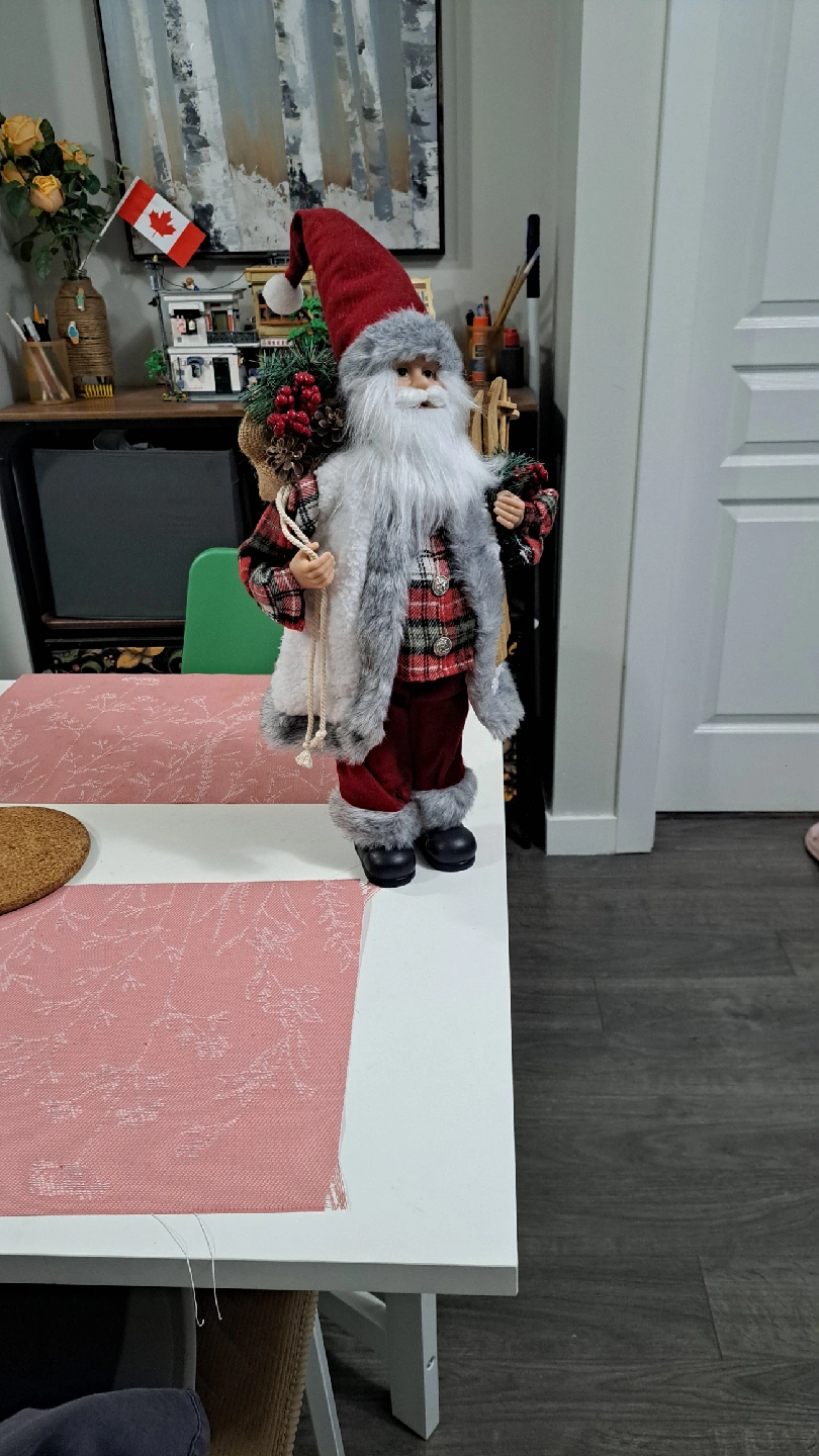A festive Santa figurine ready to bring some holiday cheer to your home! He's wearing a red and black plaid shirt with a grey faux fur vest, and carrying a sack filled with festive decorations. Perfect for adding a touch of Christmas spirit to any room