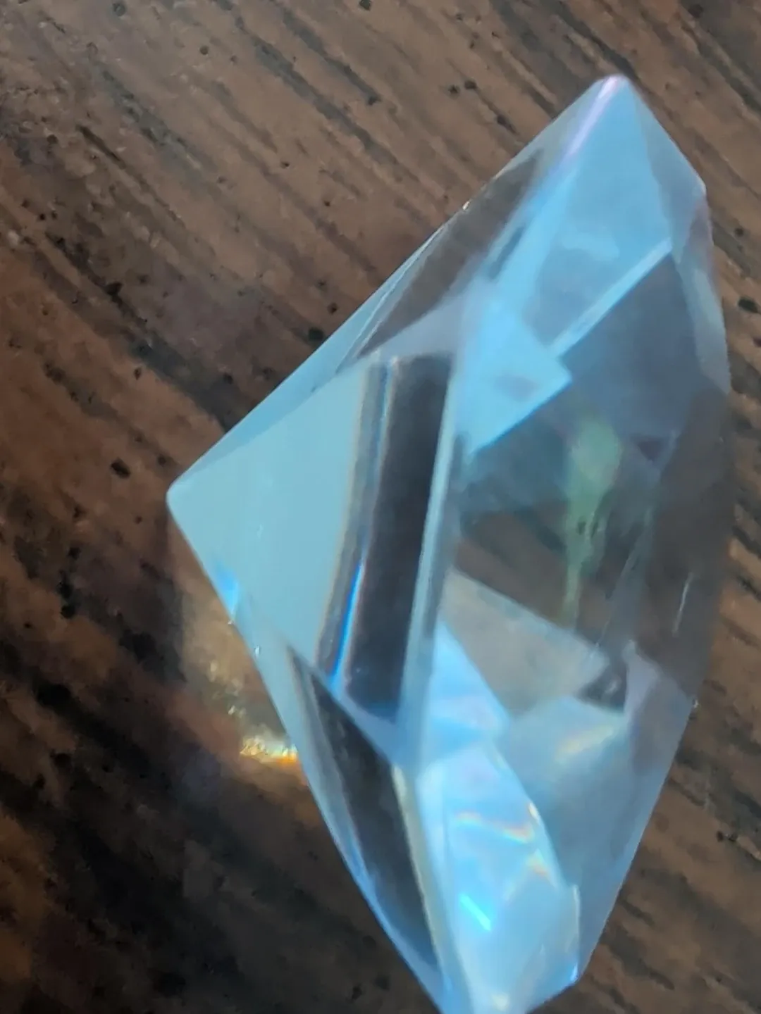 This is a clear glass crystal prism. It's multifaceted and catches the light beautifully. A nice decorative piece for a desk or shelf.