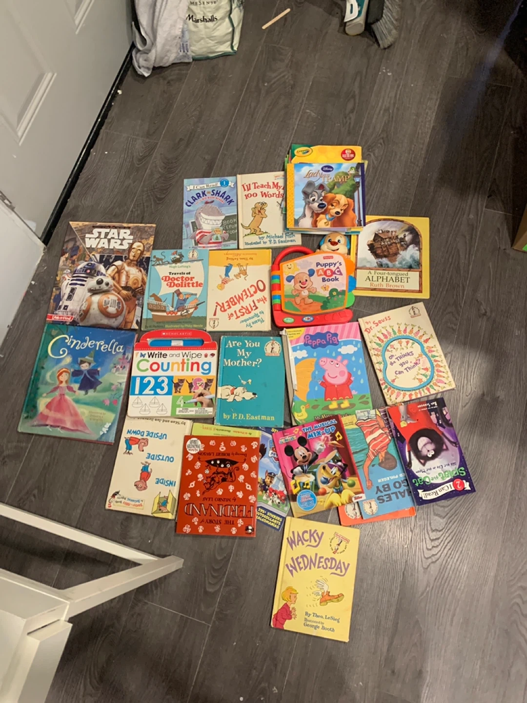 A collection of popular children's books including Star Wars, Cinderella, Lady and the Tramp, Peppa Pig, and various educational titles. Titles cover a range of themes from alphabet learning to counting and storytelling. Includes interactive books like 'Write and Wipe Counting'.