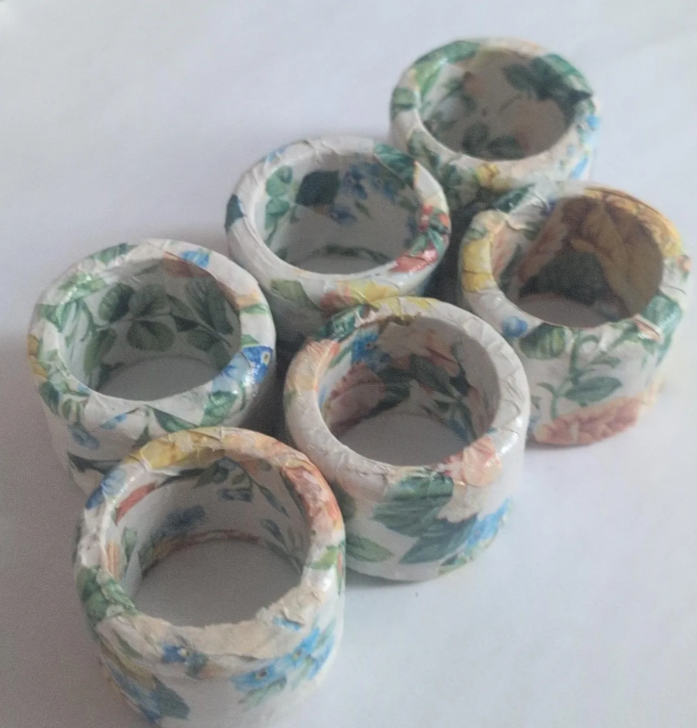 Decorative napkin rings with a floral pattern. Adds a nice touch to any table setting. Set includes six rings.