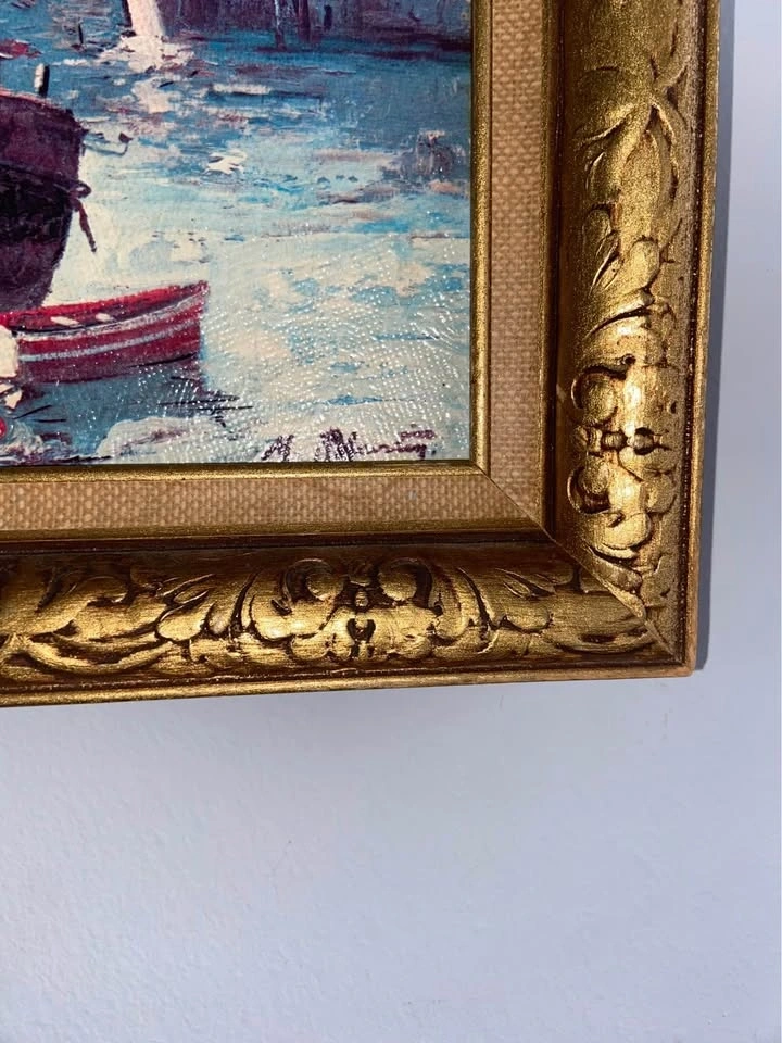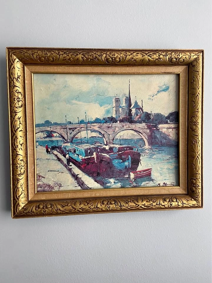 A beautiful small framed print depicting a river scene with boats and a bridge. Ornate gold frame. Artist signature visible at the bottom. Pickup available.