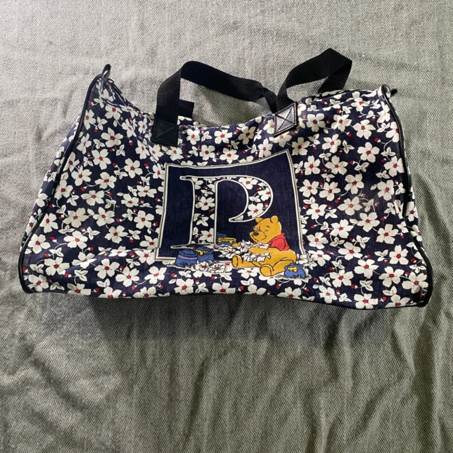 Vintage floral print duffle bag featuring Winnie the Pooh with a large 'P' initial. Zips closed and has two carrying handles. It's perfect for travel or weekend trips!