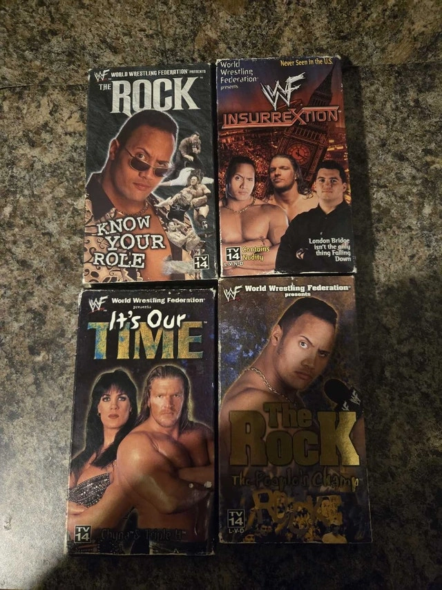 Own a piece of wrestling history with these WWF VHS tapes, perfect for any collector! This lot includes "The Rock: Know Your Role", "Insurrextion", "It's Our Time", and "The Rock: The People's Champ". These tapes are in used condition, so please expect some wear on the cases. I'm pricing them at $10 each considering their condition and collectibility. If the ad is still up, then yes, these electrifying tapes are still available!