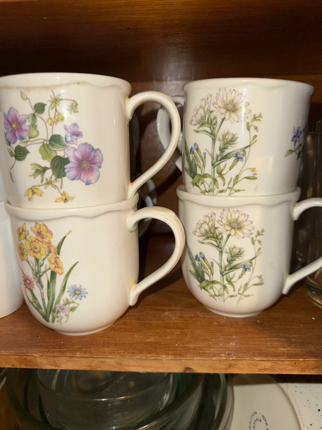 Four ceramic mugs featuring delicate floral designs. Each mug has a unique botanical illustration. Cream colored with scalloped rims. Perfect for your morning coffee or tea! Strong πͺ