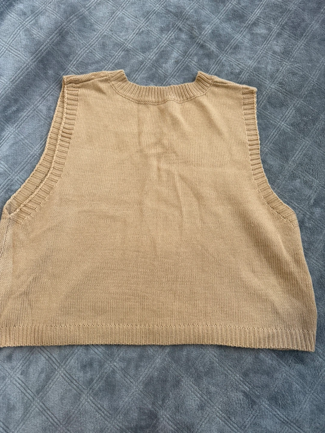A cozy cropped beige sleeveless knit vest with a classic V-neck design. Had it for a while and never wore so I'm selling it. Size XL