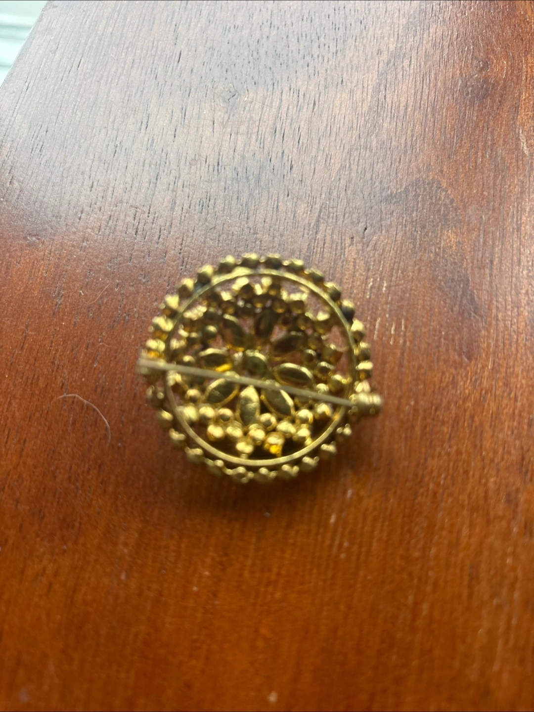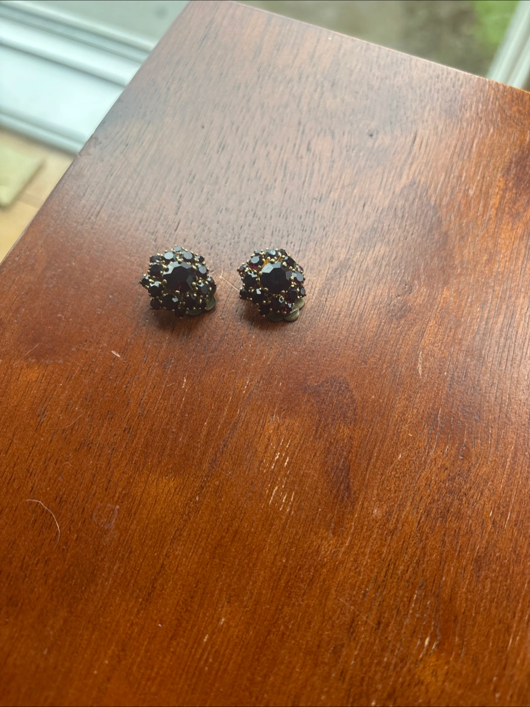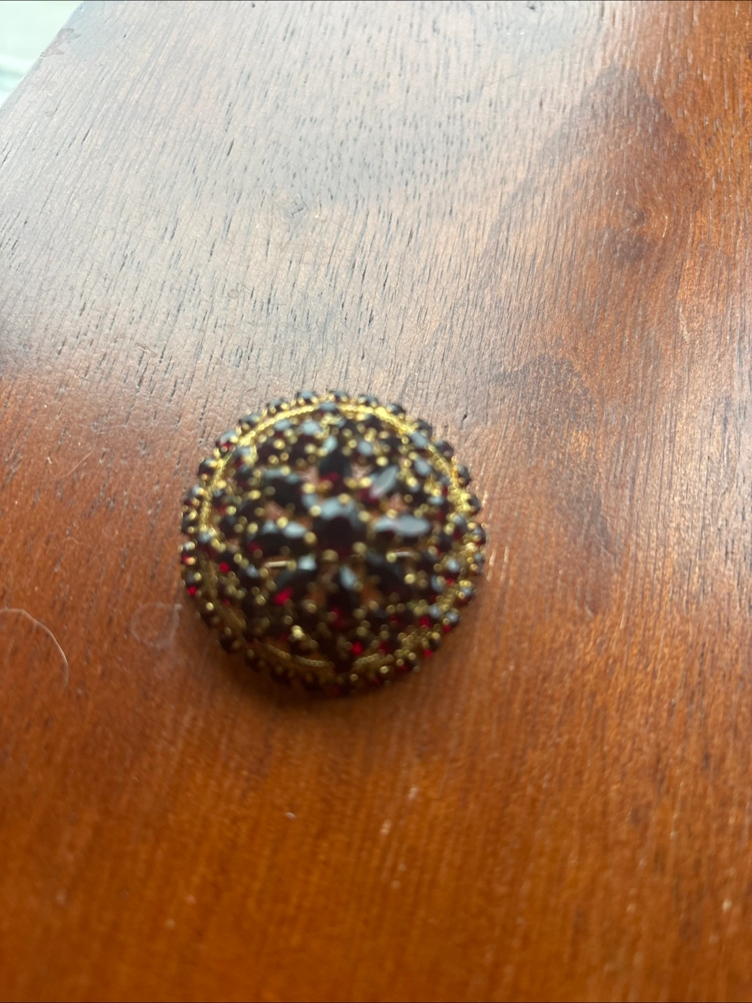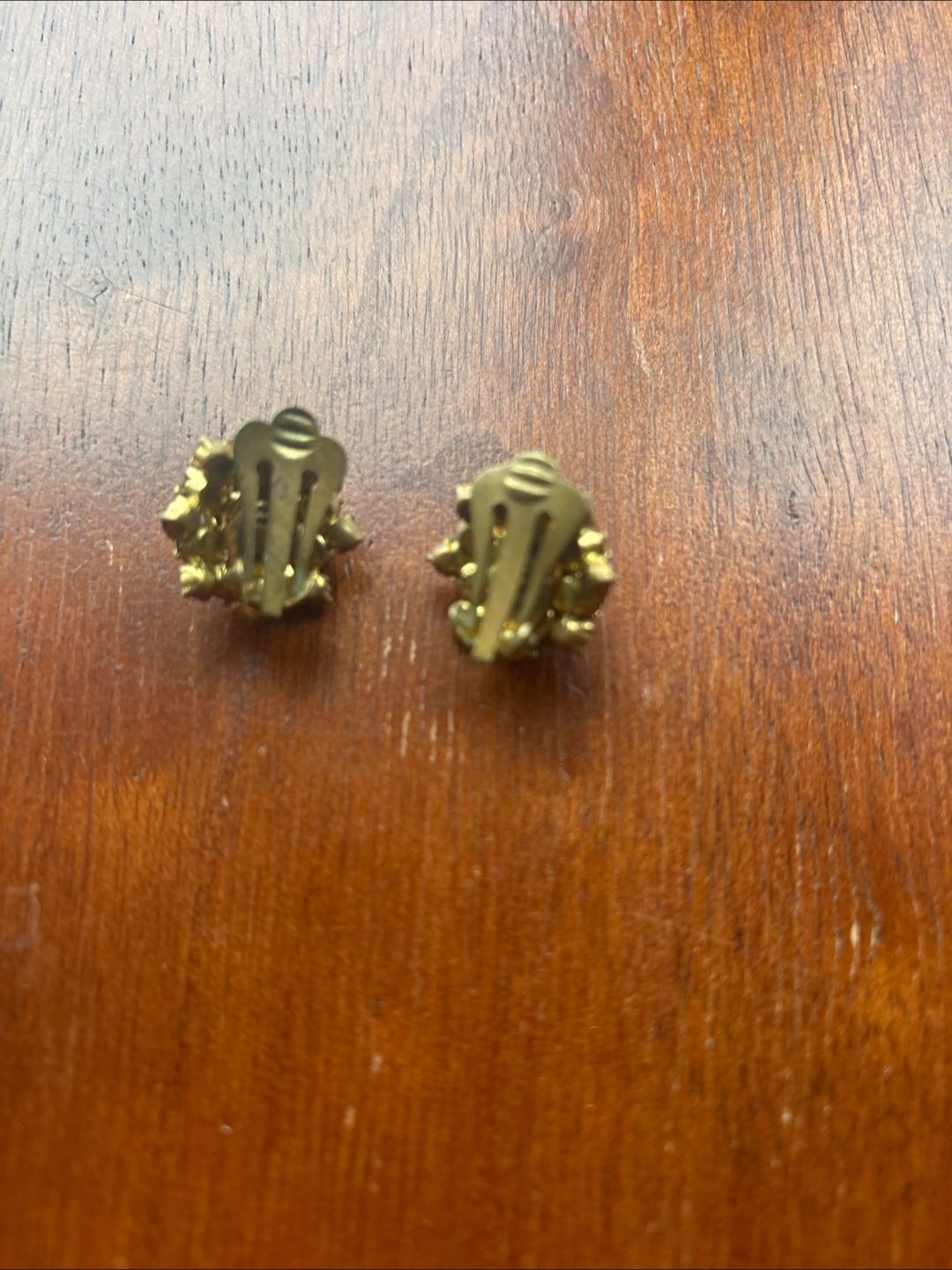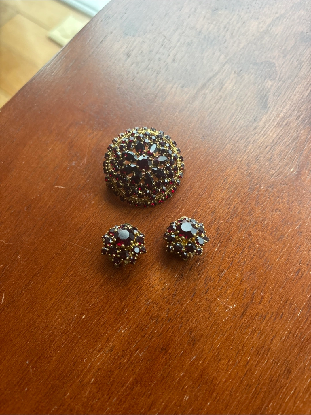 Selling a beautiful vintage brooch and clip-on earring set! The set features a gold tone metal with red rhinestones. The brooch has a floral design and the earrings complement it perfectly. They are in great condition!