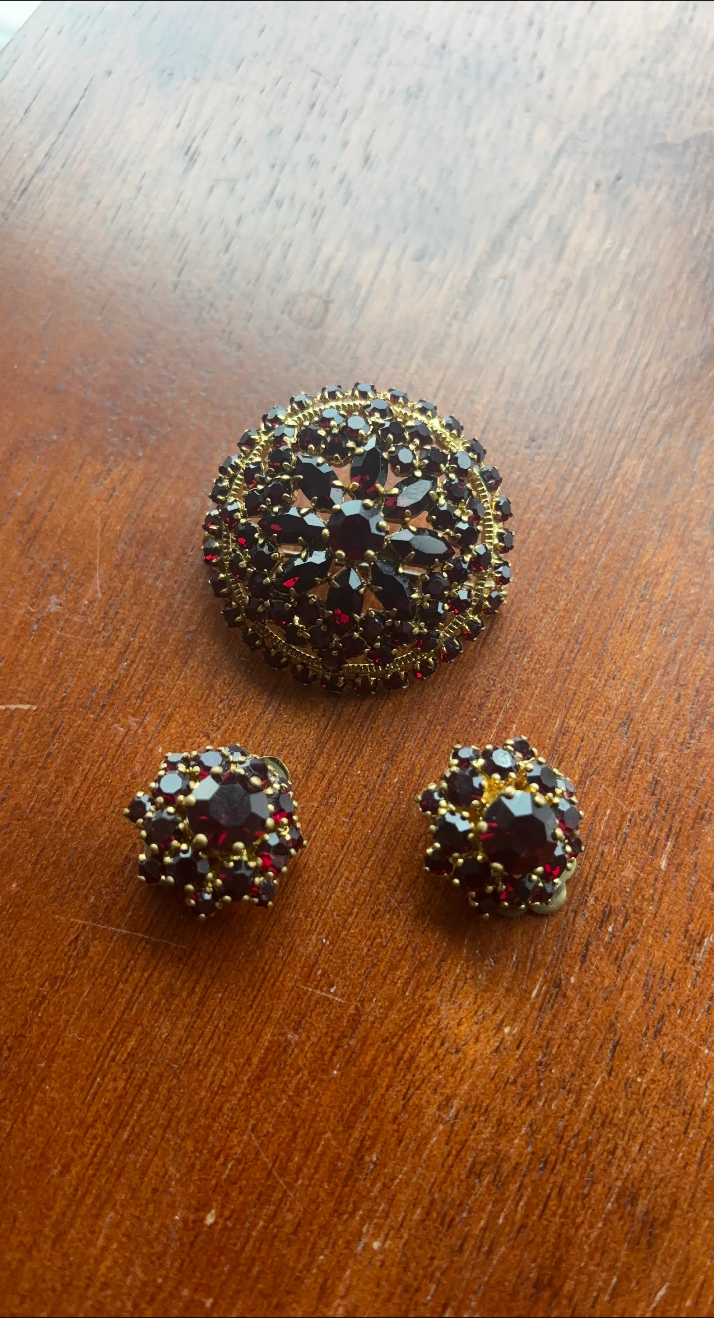 Selling a beautiful vintage brooch and clip-on earring set! The set features a gold tone metal with red rhinestones. The brooch has a floral design and the earrings complement it perfectly. They are in great condition!