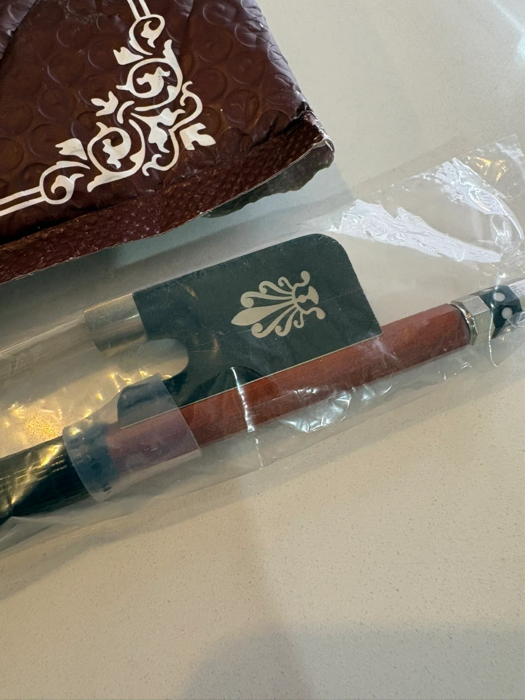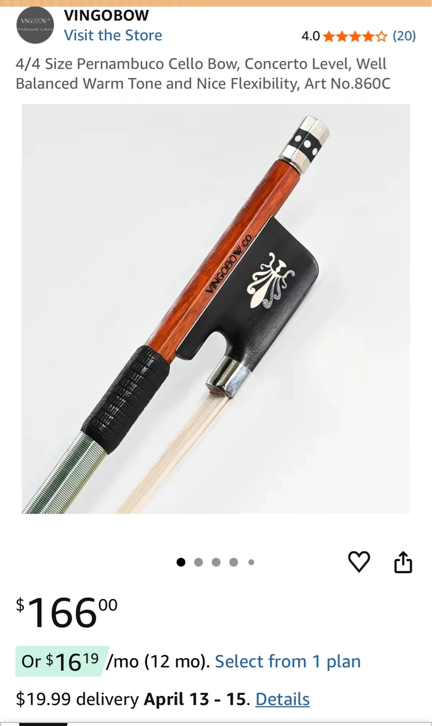 This is a 4/4 size Pernambuco cello bow from VingoBow. It's designed for concerto level playing, offering a well-balanced warm tone and nice flexibility. The bow comes with its original packaging.