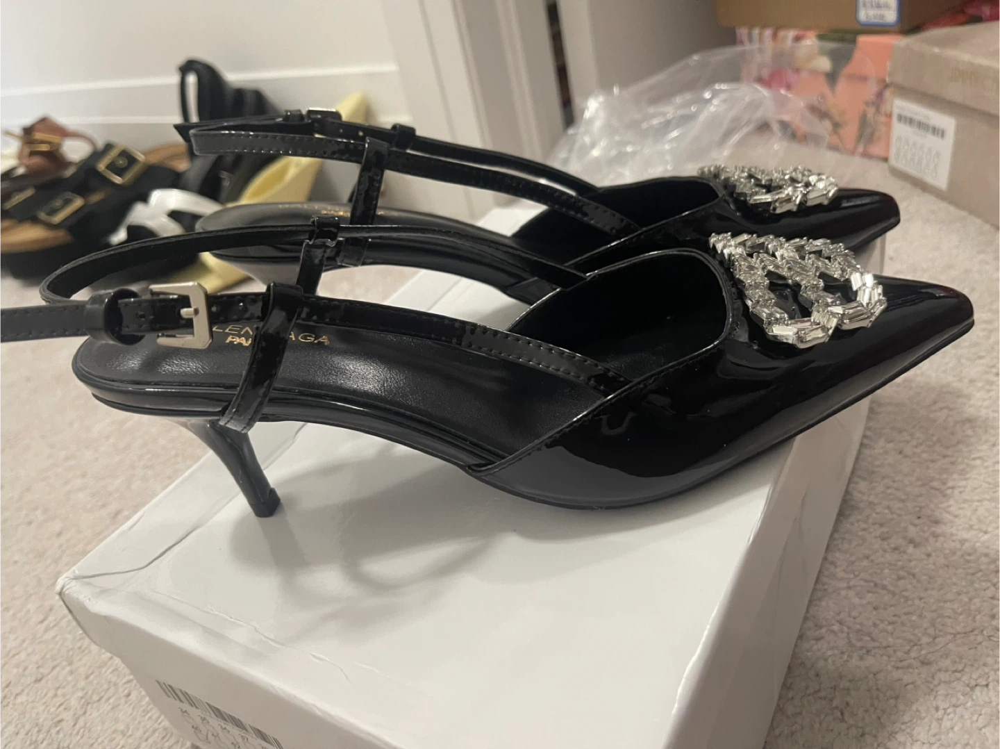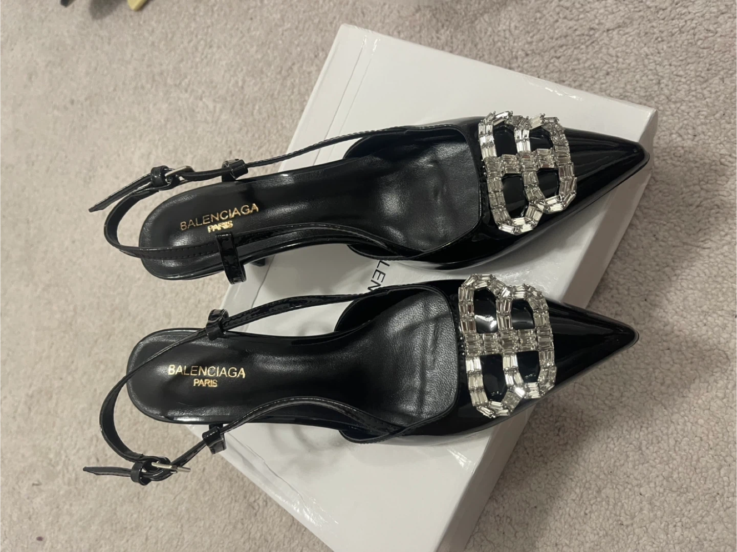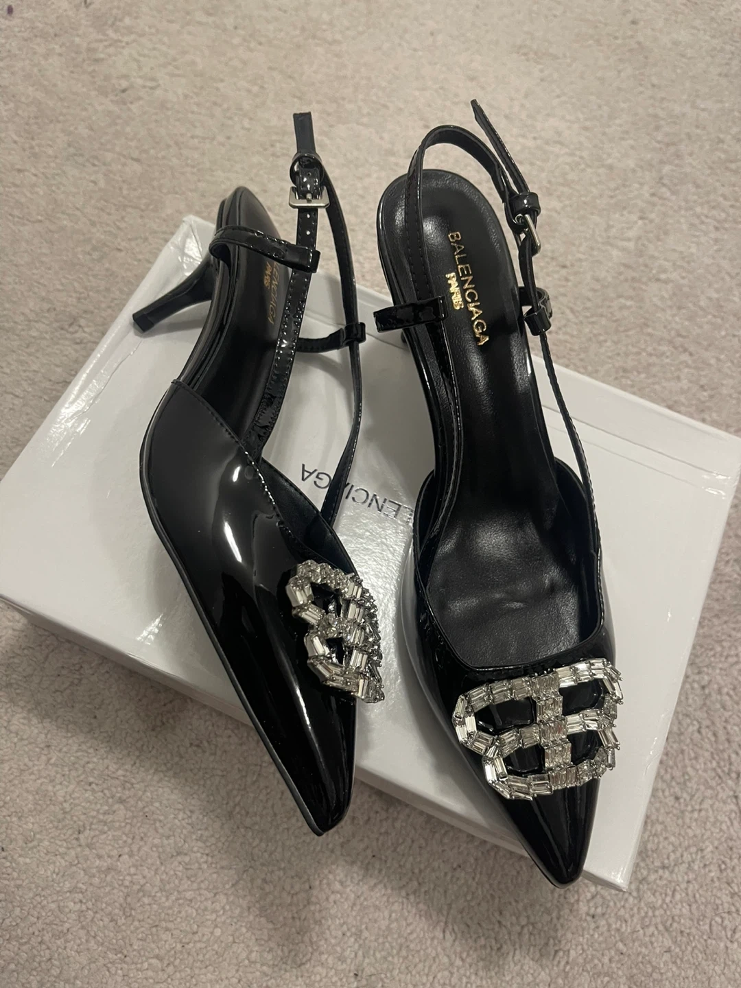 Selling a pair of Balenciaga black heels. They are size 37. The heels have a shiny, patent leather look and feature a decorative crystal "B" logo. They come with their original box!