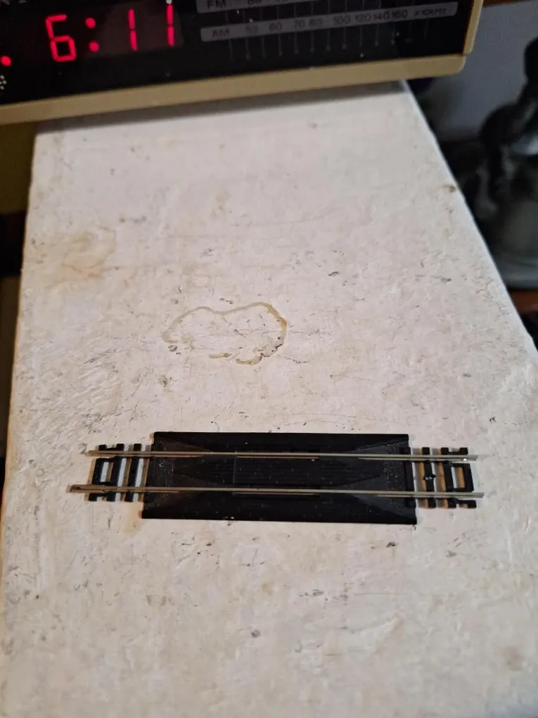 This is a section of model uncoupler train track. It's made of metal rails and a black plastic base.