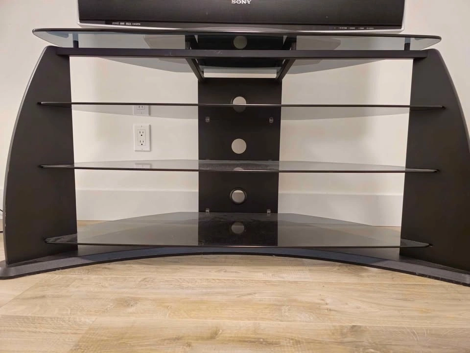 Stylish black TV stand with curved tempered glass shelves and a solid frame. Sturdy, modern design—perfect for living room, bedroom, or entertainment area. Fits TVs up to 50–55 inches (approx.). 3-tier glass shelves for cable box, gaming console, sound system, or décor. Cable management holes at the back for a clean setup. Strong and stable construction. Good condition, clean glass, no cracks. Minimal, modern look that suits any décor. Best for small spaces, sits well in corners too.