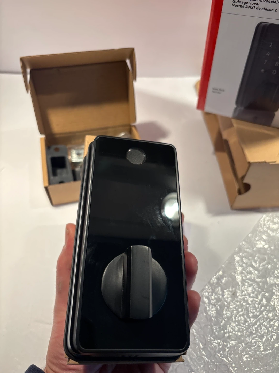 New Honeywell Digital Biometric Deadbolt with Electronic Touchscreen. It offers fingerprint entry and keypad access. The lock is matte black and includes all necessary hardware for installation.