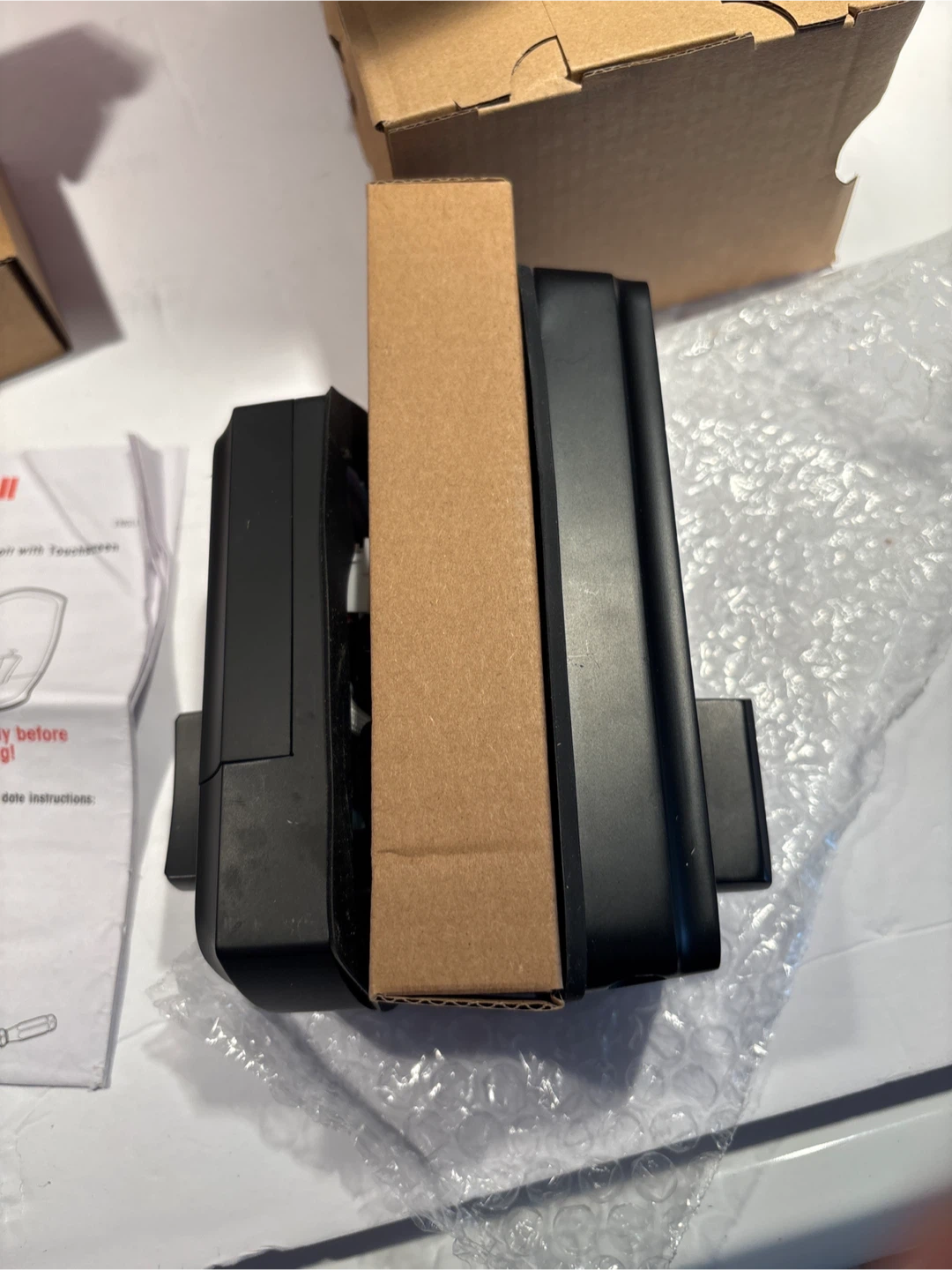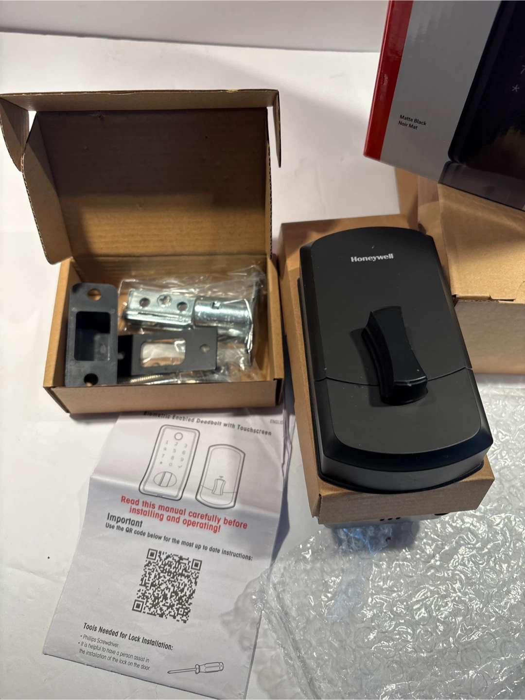 New Honeywell Digital Biometric Deadbolt with Electronic Touchscreen. It offers fingerprint entry and keypad access. The lock is matte black and includes all necessary hardware for installation.