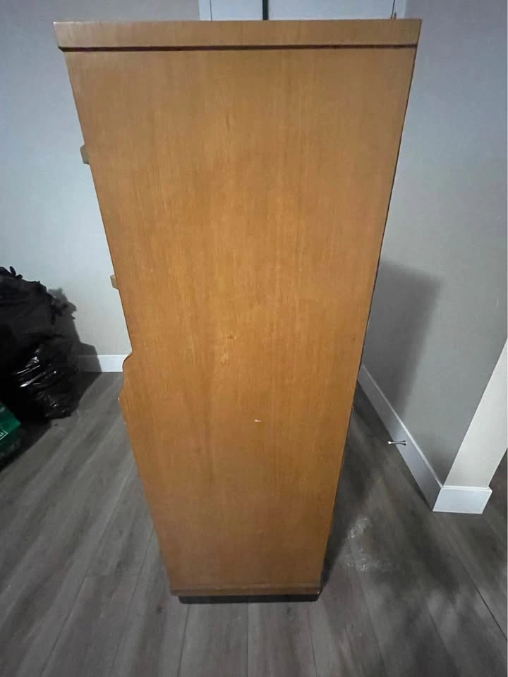 Pick up only. One little bit is chipped but it’s not very noticeable only when you’re up close. The drawers are able to hold a bit of stuff, there’s 5 in total. The measurements are H: 50”, L: 34.5”, W: 17”. Let me know if you’re interested!