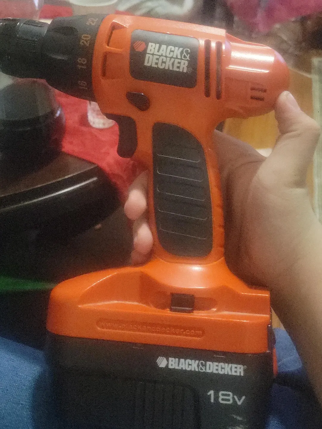 This is a Black & Decker 18V cordless drill. It features a variable speed trigger and a comfortable grip. Power output is 18V.