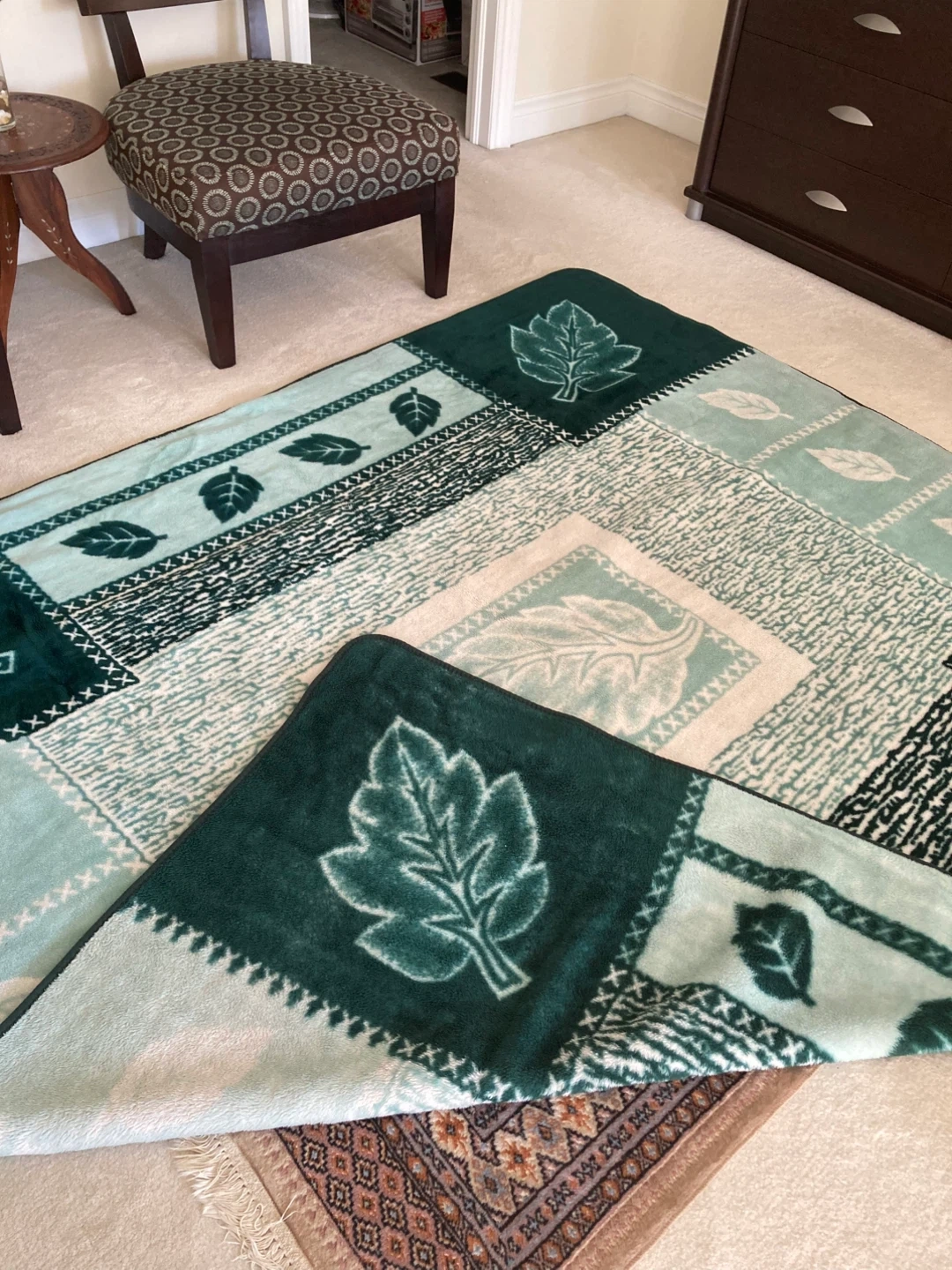 Here's a cozy blanket with a leaf pattern. It's in great condition and ready to keep you warm on chilly nights!
