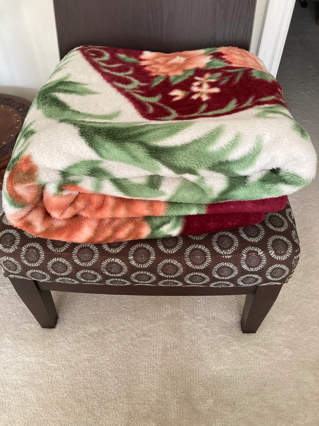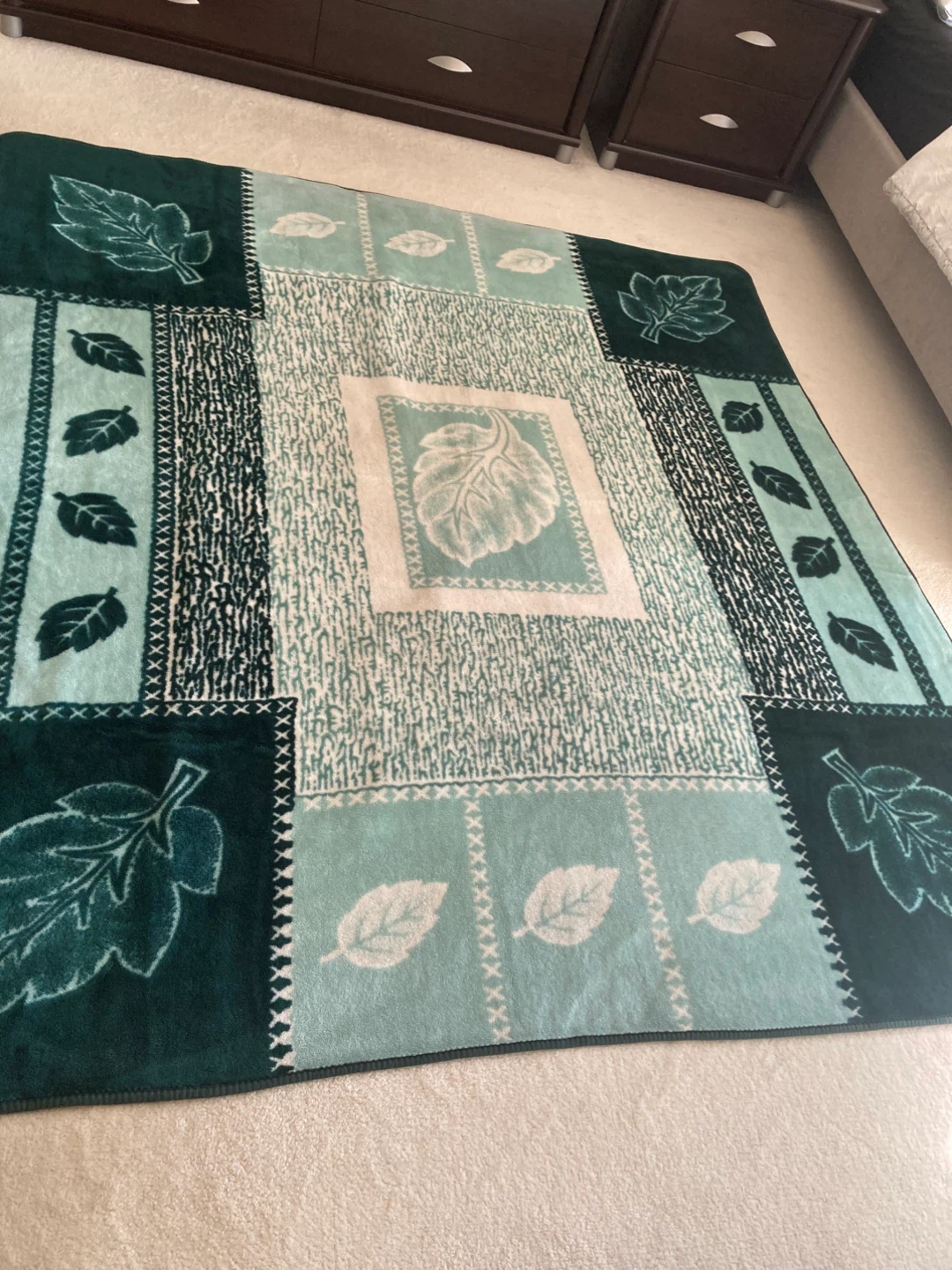 Here's a cozy blanket with a leaf pattern. It's in great condition and ready to keep you warm on chilly nights!