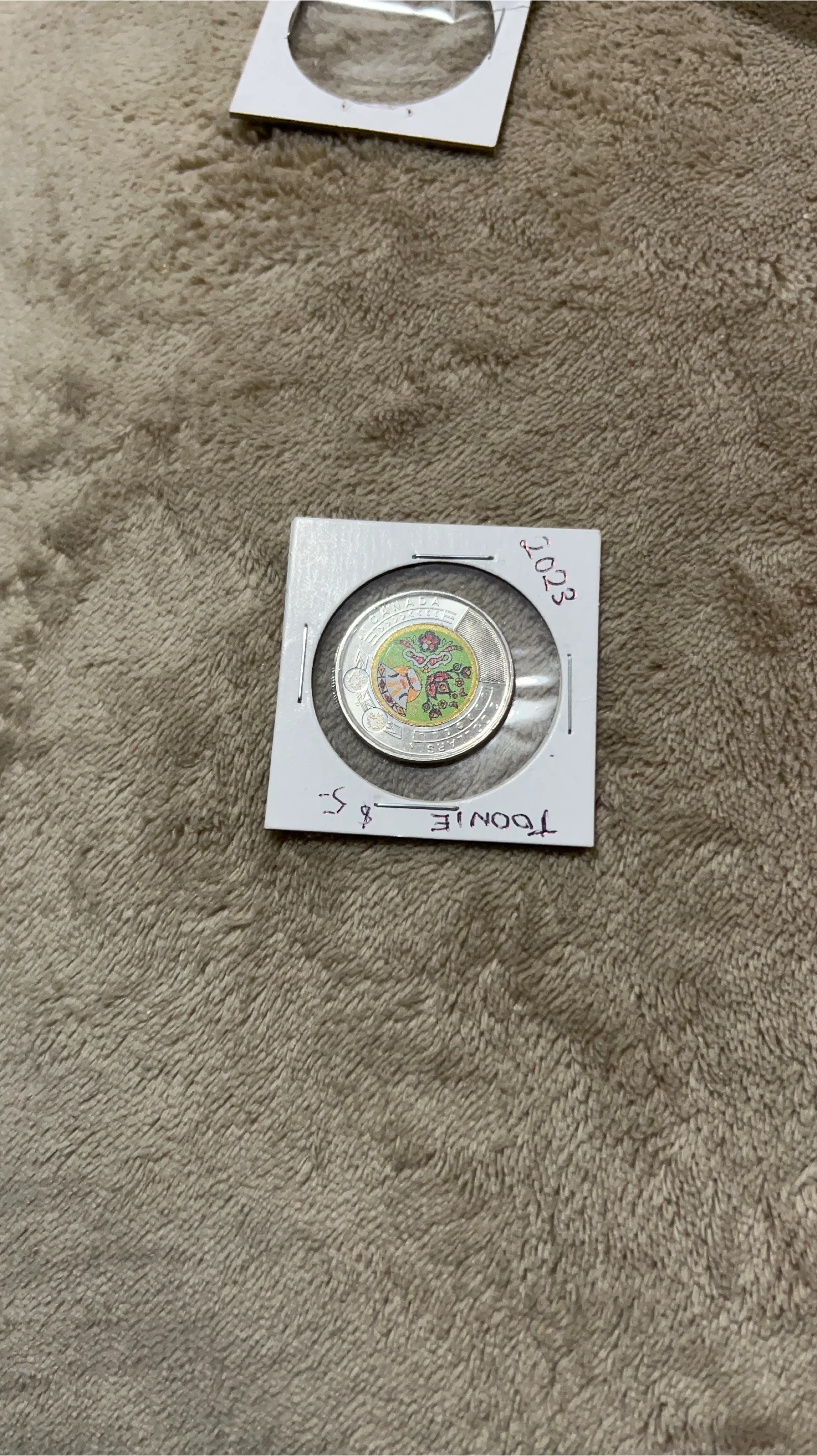 This is a 2023 Canadian two-dollar coin, also known as a toonie. It comes in a protective holder for safekeeping. This coin features a unique design.