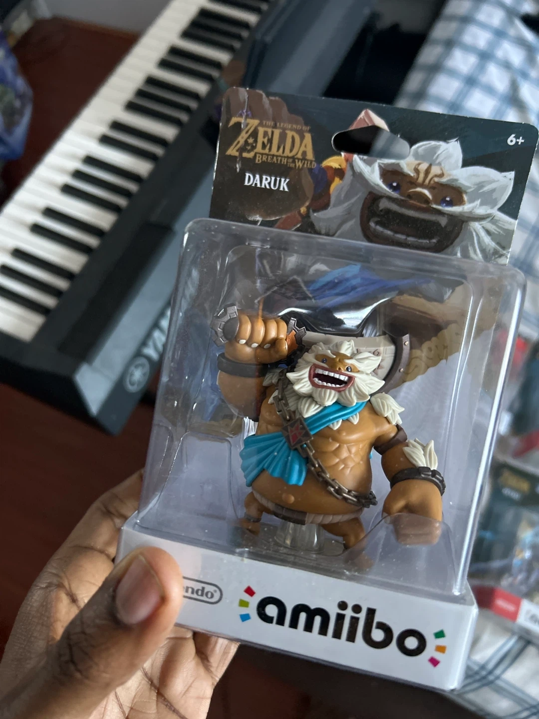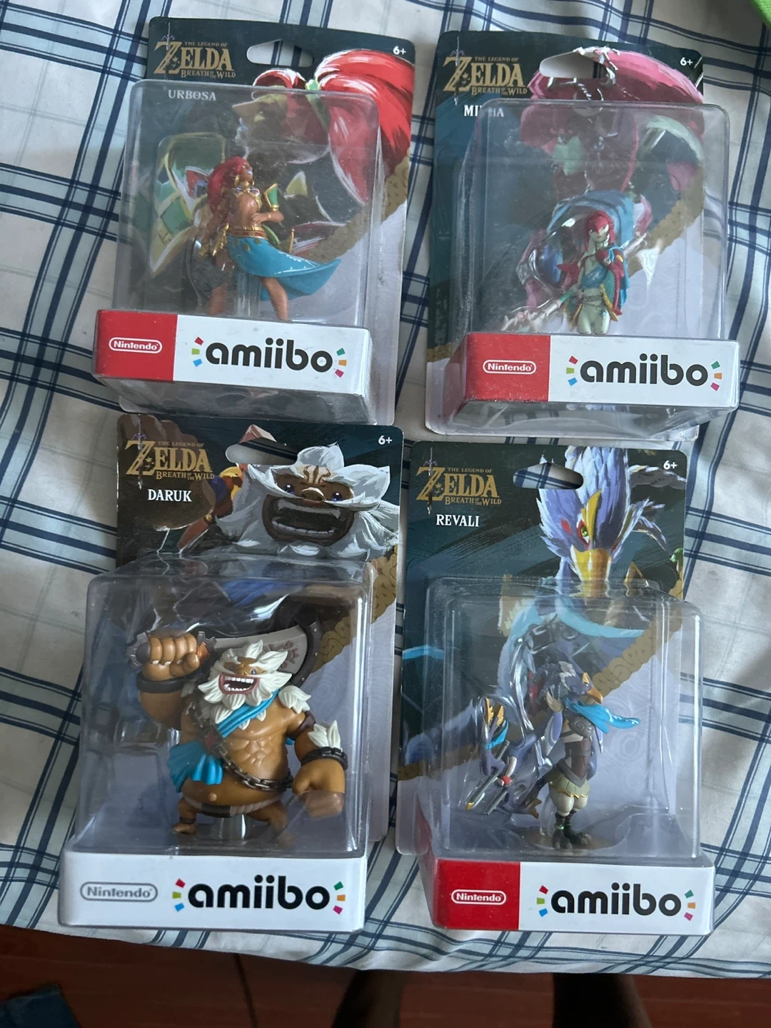 Four Nintendo Amiibo figures from The Legend of Zelda: Breath of the Wild series. Includes Mipha, Urbosa, Daruk, and Revali. Figures are new in packaging. Revali and Derik boxes in fantastic condition. Urbosa and Mipha boxes in decent condition