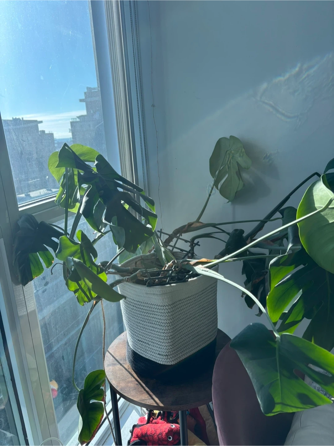 A Monstera plant in a two-toned woven basket pot. It's a lovely houseplant with characteristic split leaves. This plant would brighten up any room!