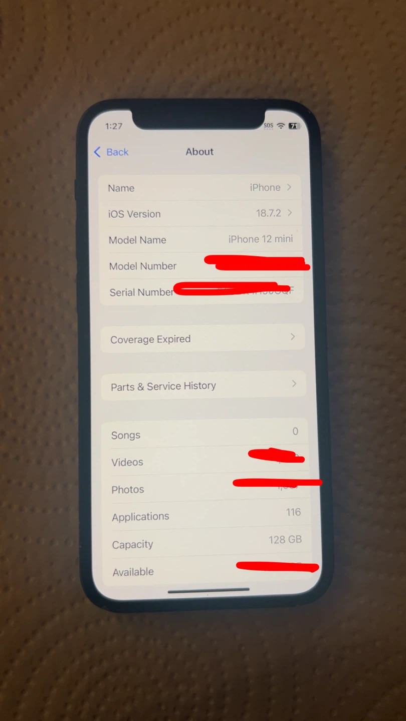 Selling an iPhone 12 mini with 128GB of storage. The model number is MGDJ3VC/A. It's running iOS version 18.7.2