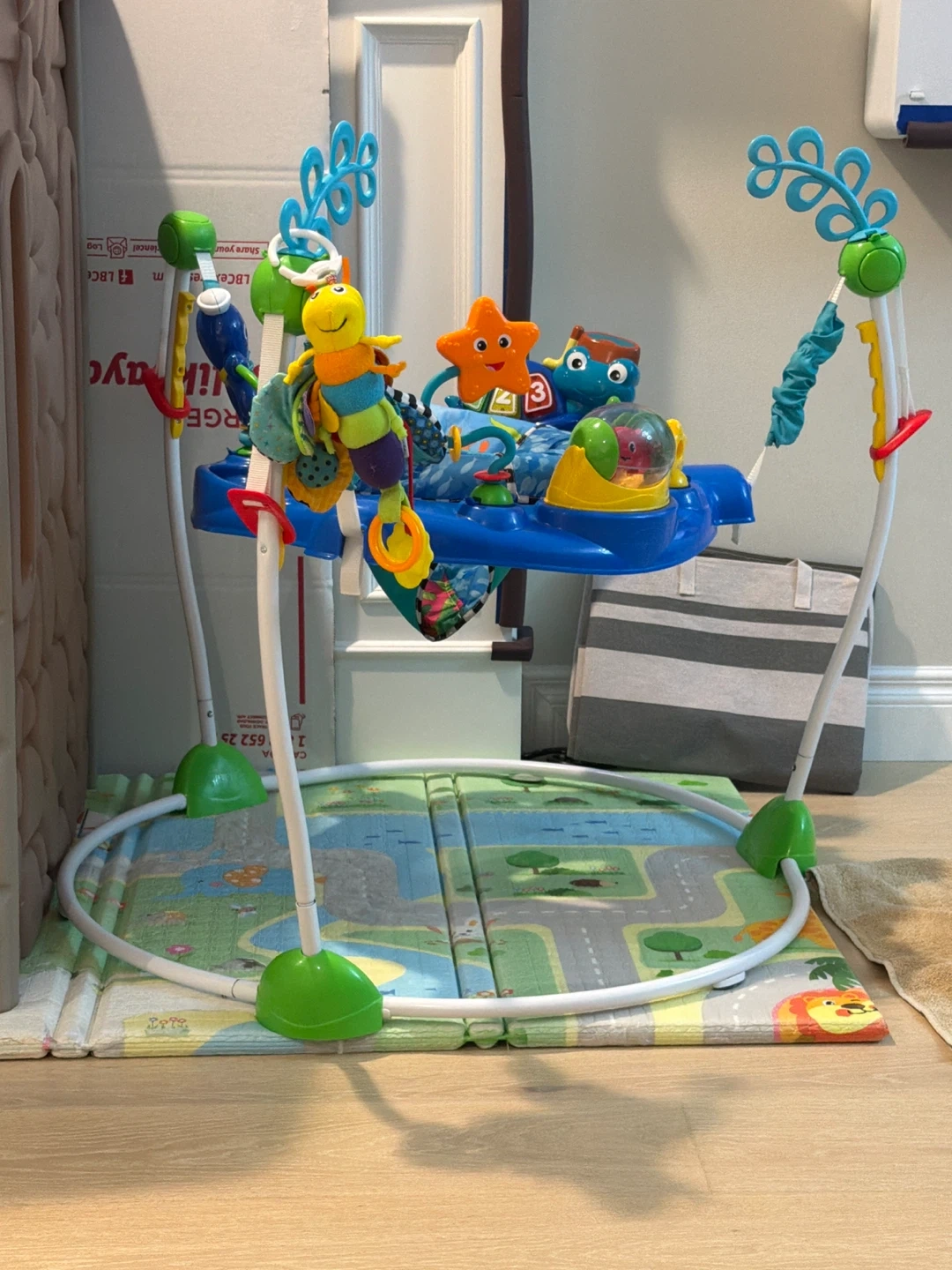 This Baby Einstein jumperoo is designed for little ones to play and bounce. It has a variety of colourful toys attached for entertainment. The seat is blue and it comes with a padded mat.