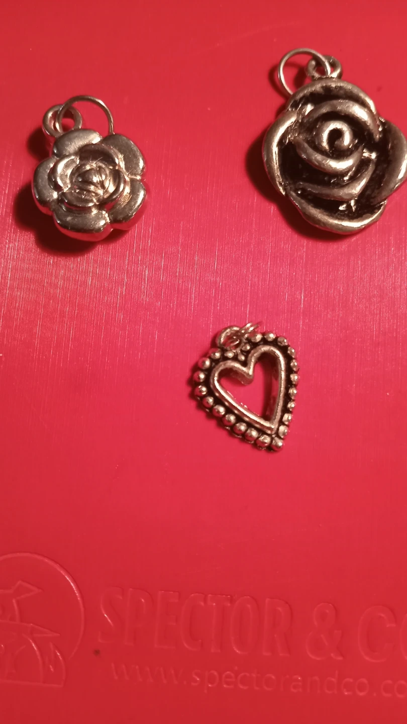 Selling a set of three cute charms! There are two rose charms and one heart charm. Perfect for jewelry making or adding to a keychain