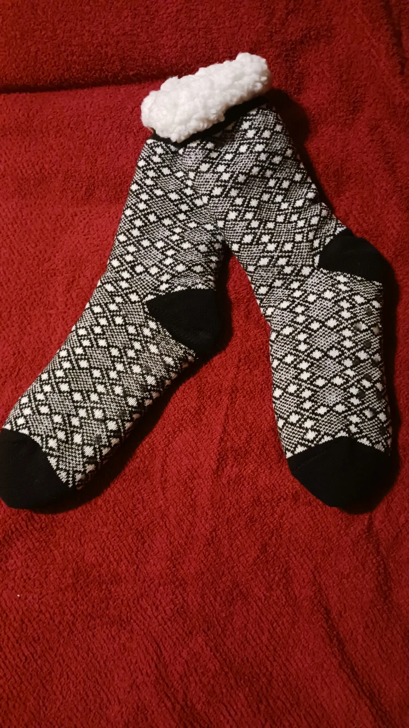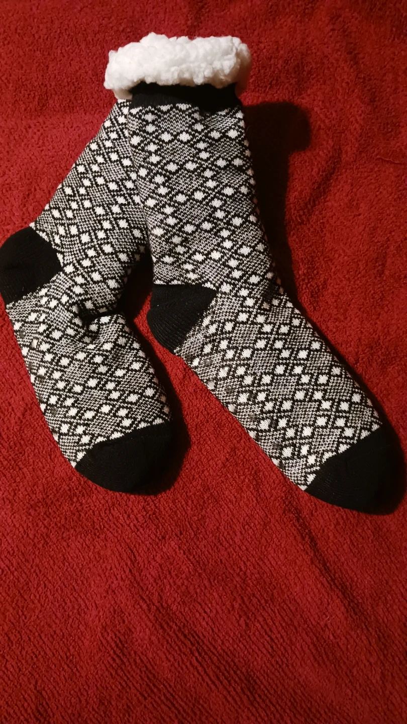 Cozy sherpa lined socks with a black and white fair isle pattern. These socks are designed for warmth and comfort. They feature a soft, fuzzy lining and a classic knit design.