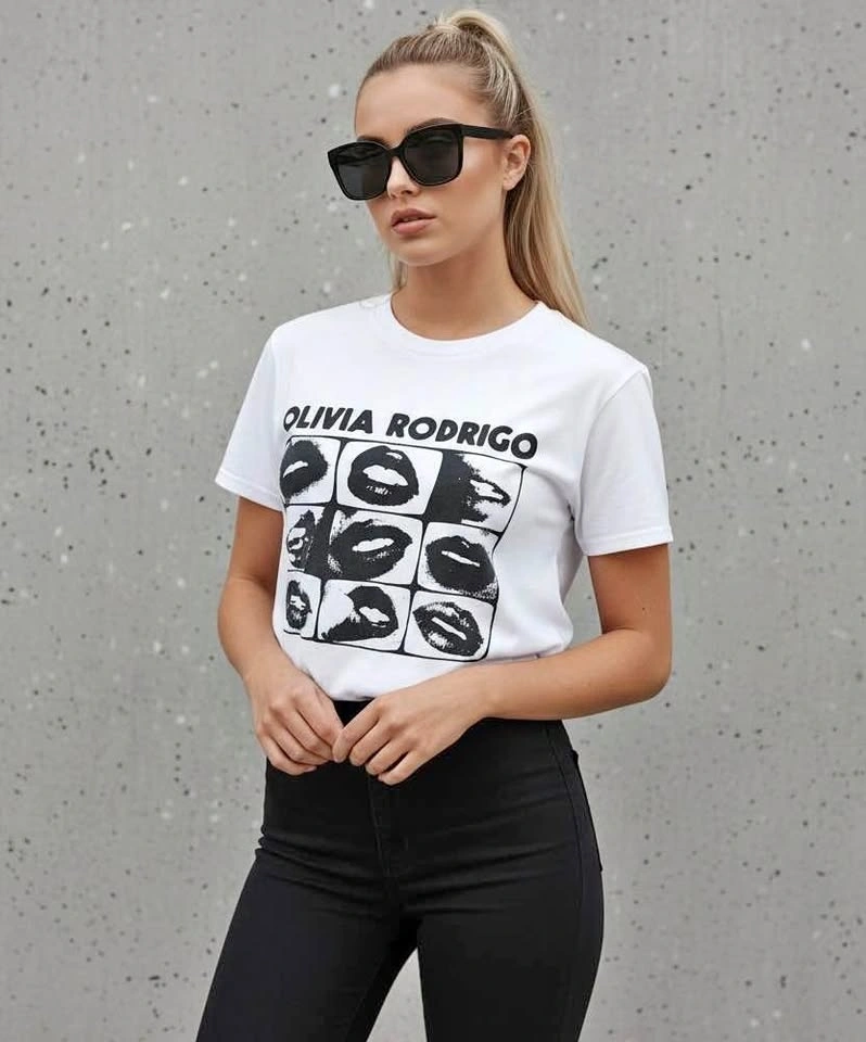 Olivia Rodrigo graphic t-shirt, bold black and white lip grid design, short-sleeve crewneck, 100% cotton. For fans of the GUTS or SOUR eras.
