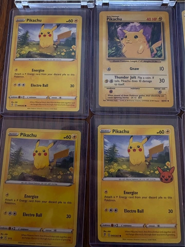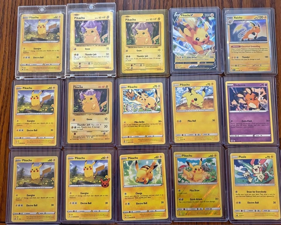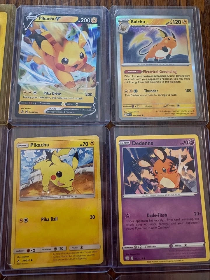 Selling a Pikachu-themed Pokémon card lot featuring 15 cards total. Includes multiple unique Pikachu artworks from different modern sets, Pikachu V, a Raichu holo, Plusle, and Dedenne. All cards are sleeved and in good condition (near mint to lightly played). Great for Pikachu collectors or binder displays. Asking $50 or best offer. Local meetup only.