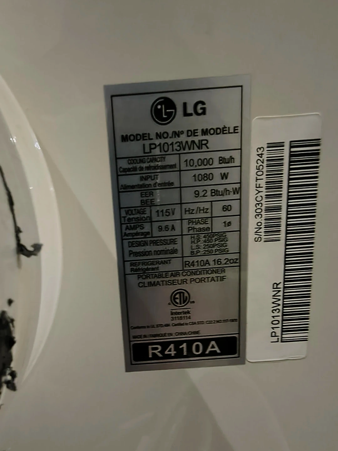 This LG portable air conditioner has a cooling capacity of 10,000 BTU/h. It's a 1080 W unit with a voltage of 115V. Includes exhaust hose and window vent kit.